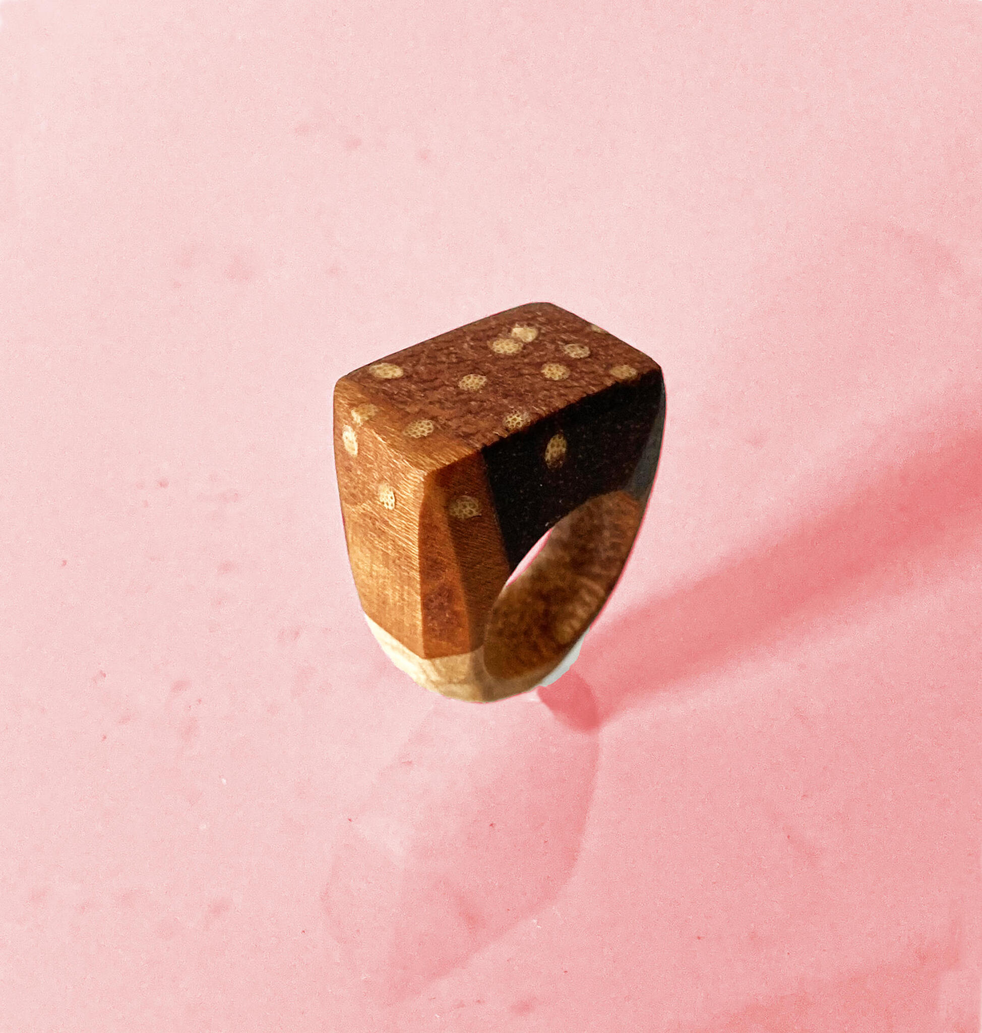 Deze vrolijke ring met stipjes is gemaakt van vier verschillende soorten hout. Dit zijn bamboe, azobé, kersenhout en esdoorn. De bovenkant is afgevlakt en vrij donker van kleur, waardoor de bamboe stipjes goed in beeld komen. Meer info en foto's zijn te vinden op: https://sieradenvanhout.nl/product/vrolijke-ring-met-stipjes/