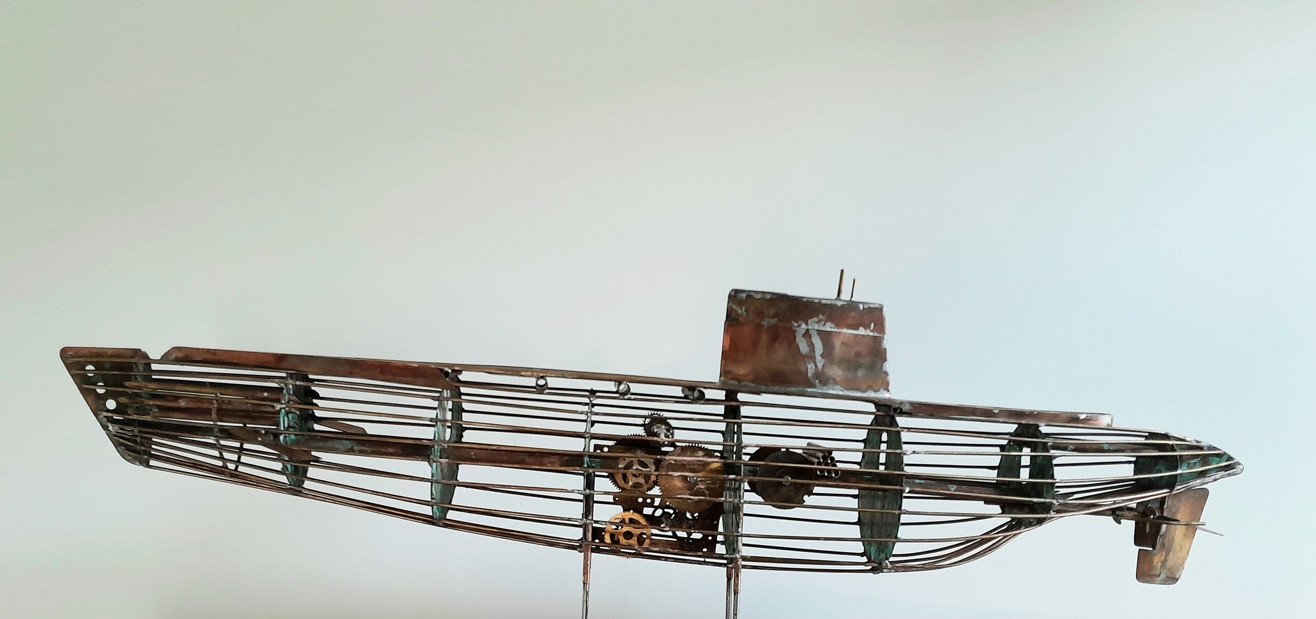 Het project, Dit is geen onderzeeër. Het is een kunstobject geïnspireerd door onderzeeërs. De rondingen, mannelijke en vrouwelijke vormen. De technologie, de complexiteit, de uitdaging. Angst, ontzag, durf, moed en waanzin. Het moedigt mensen aan om hun leven te riskeren. Een metalen omhulsel, als bescherming tegen de diepte van de zee. The dynamic structure of The Project, with its open framework and interplay of organic and metallic elements, exudes a sense of exploration and resilience. The suspended, ship-like form set against the abstract, turbulent backdrop creates a narrative of movement, challenge, and triumph that is both visually compelling and deeply evocative. Its bold presence and meticulous detail would make it a standout piece in a digital exhibition, engaging viewers with its layered meaning and artistry. Het lijkt op een onderzeeër en zo is het allemaal begonnen. De uitdaging om vorm en complexiteit weer te geven. De strijd met weerbarstig koper. Het is uiteindelijk een project geworden. Een project van 3 maanden! Het is tijd voor een nieuwe uitdaging.