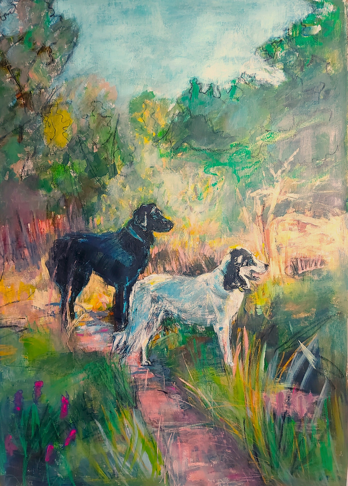 Schilderij van onze honden Dusan, een flatcoated retriever, en Farah, geadopteerd uit Roemenie
