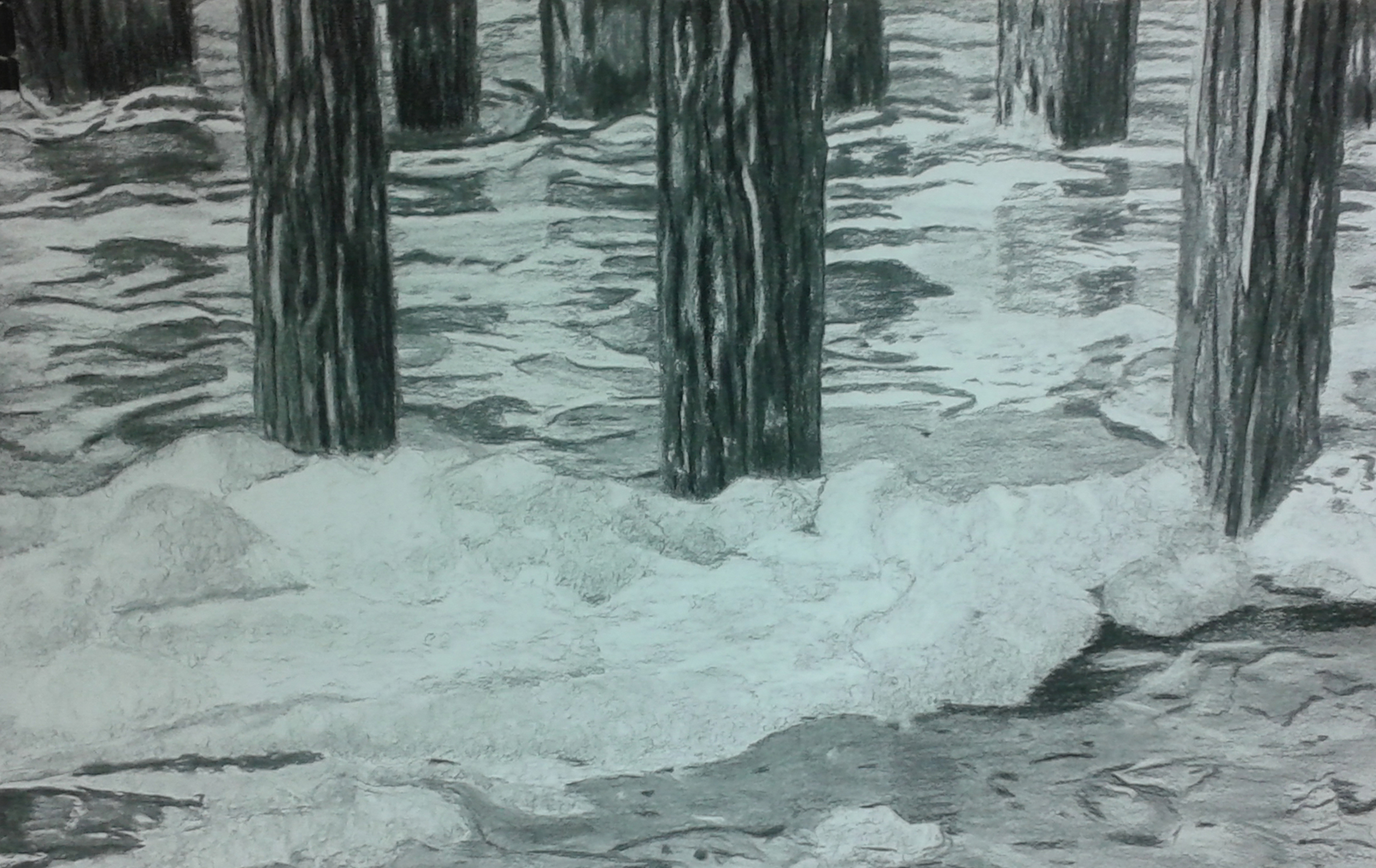 Strandpalen aan de rand van de zee in het opspattend schuim. Houtskool en siberisch krijt.
