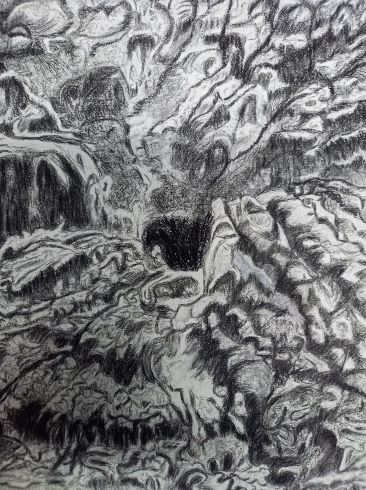 Een kwart van de bovenkant van een strandpaal, erg veel in te zien. Houtskool en siberisch krijt.