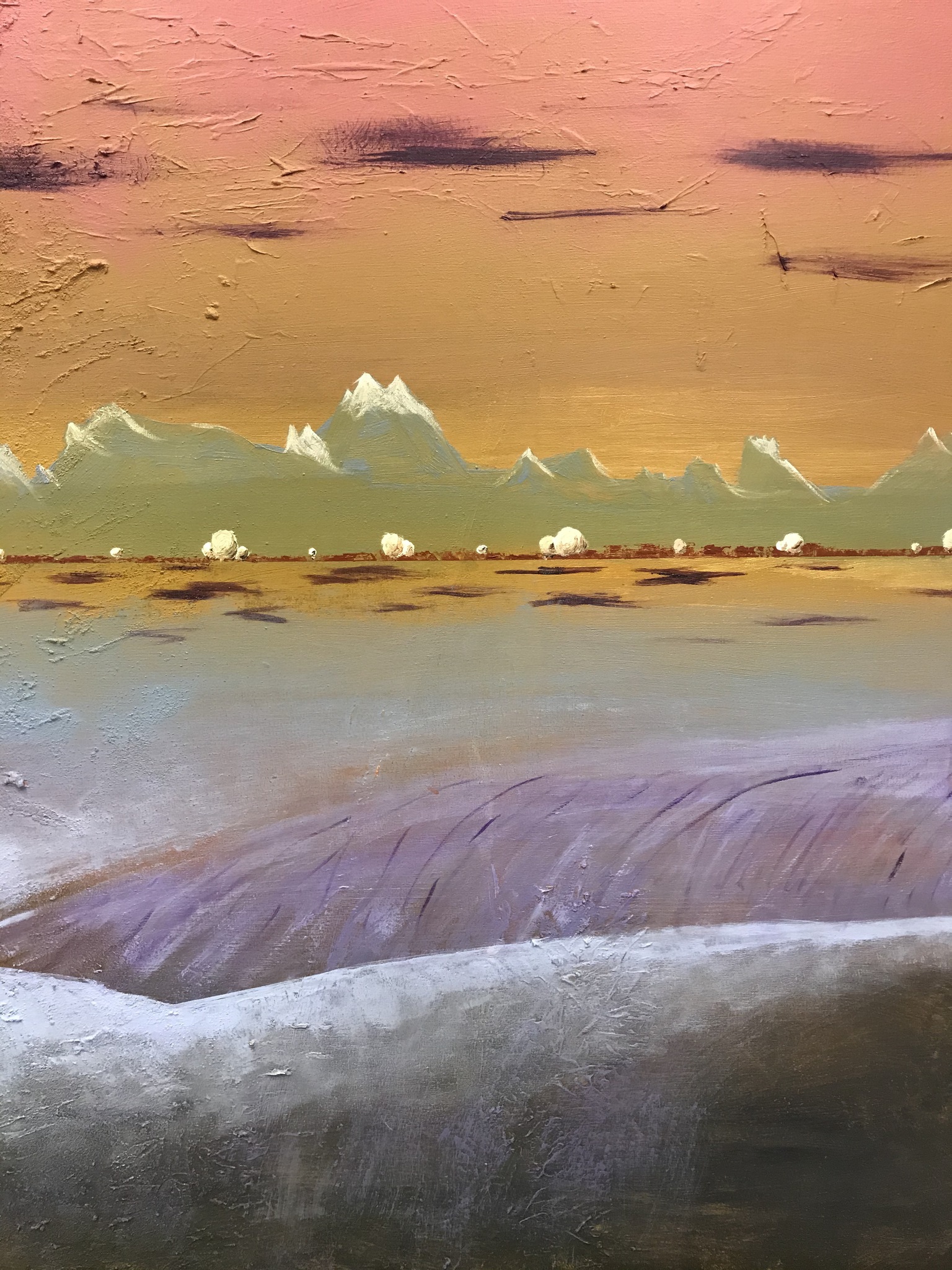 Ik schilder met acryl op doek met soms architectonische achtergronden. Met de menselijke figuren die ik erin aanbreng (geschilderd of als collage) probeer ik een verhaal te vertellen.