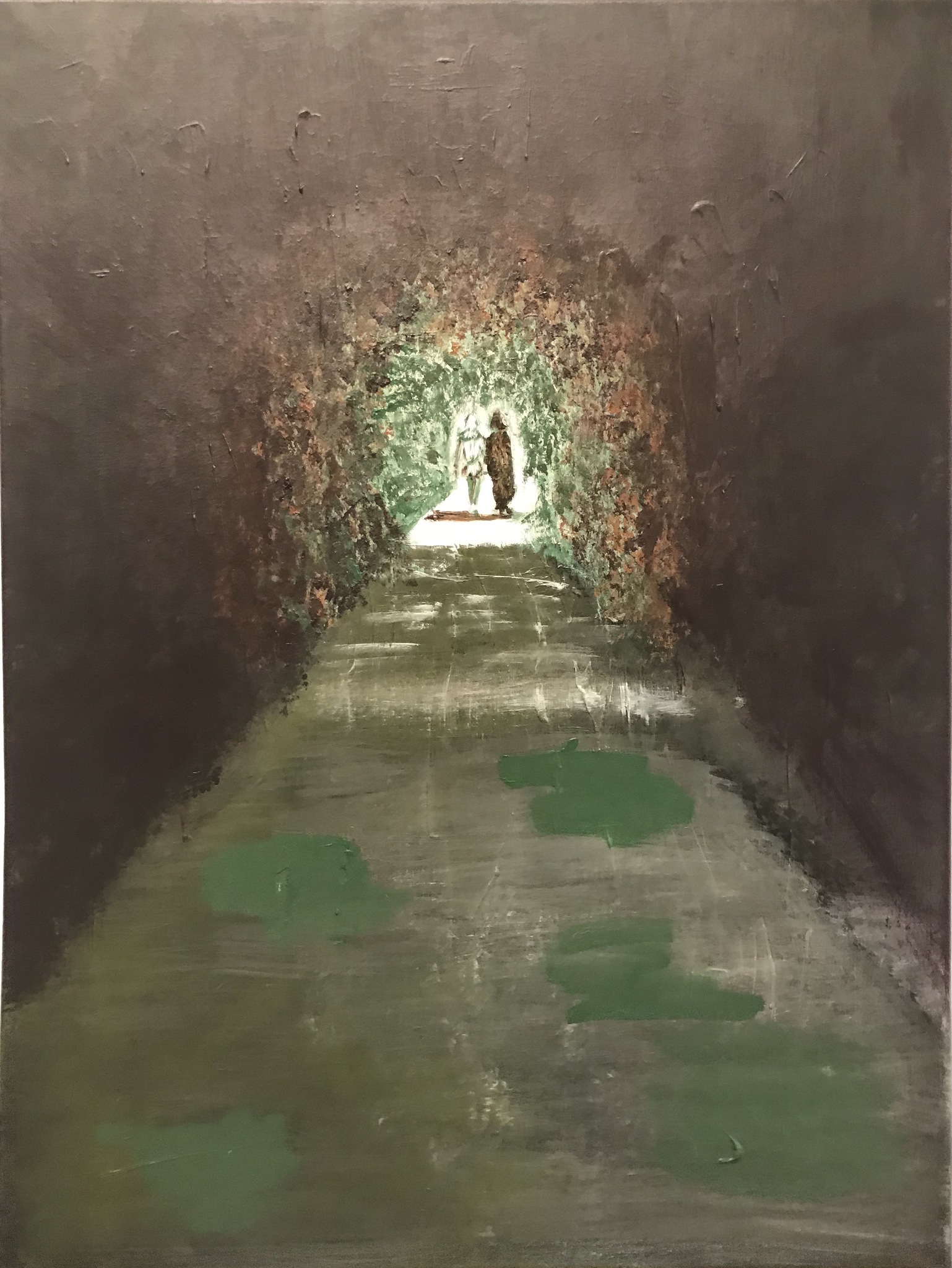 Ik schilder met acryl op doek met soms architectonische achtergronden. Met de menselijke figuren die ik erin aanbreng (geschilderd of als collage) probeer ik een verhaal te vertellen.
