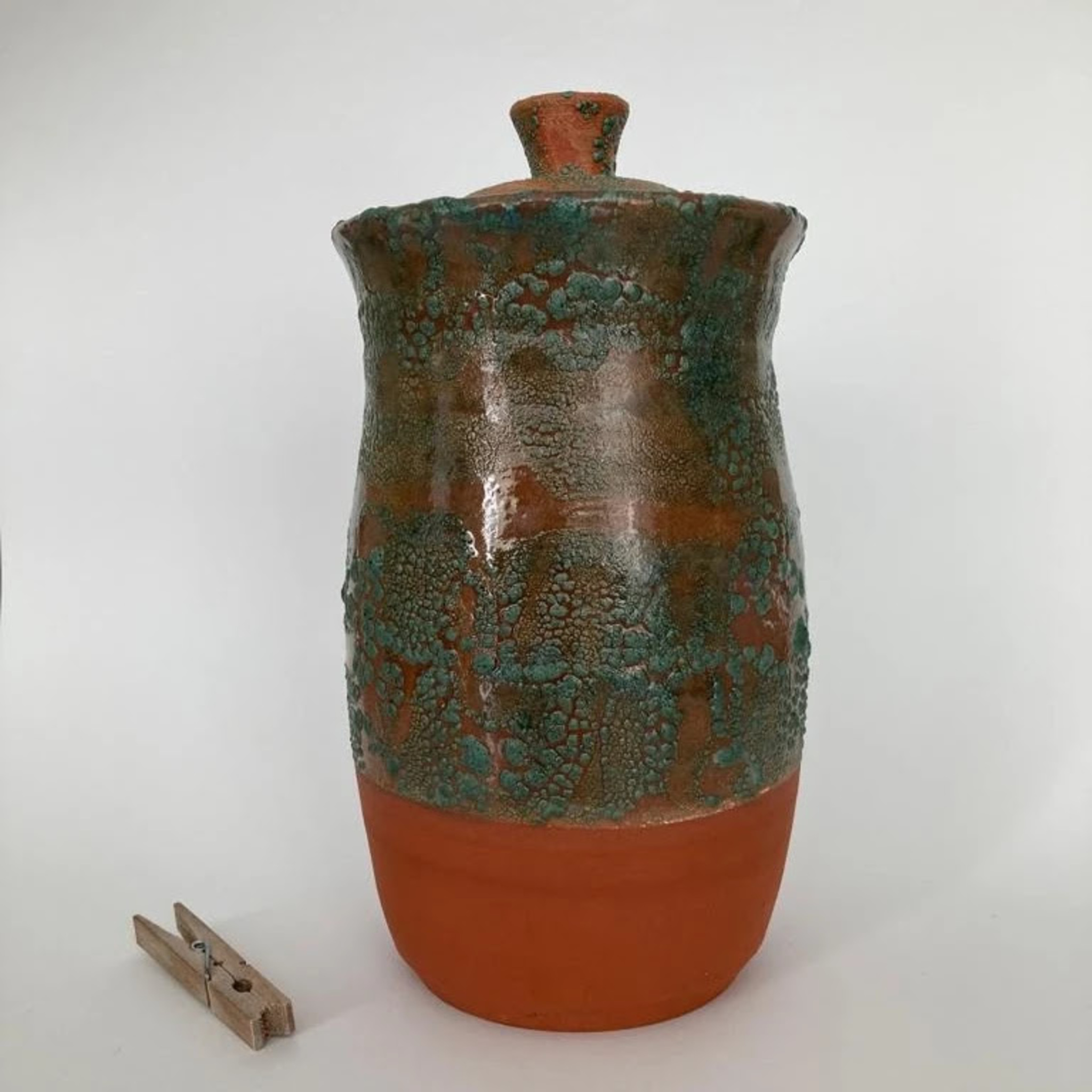 Eerste dekselpot uit een serie van vier op de draaischijf gedraaide dekselpotten; rode scherf gestookt met eigen ontwikkeld glazuur op 1150 ºC.