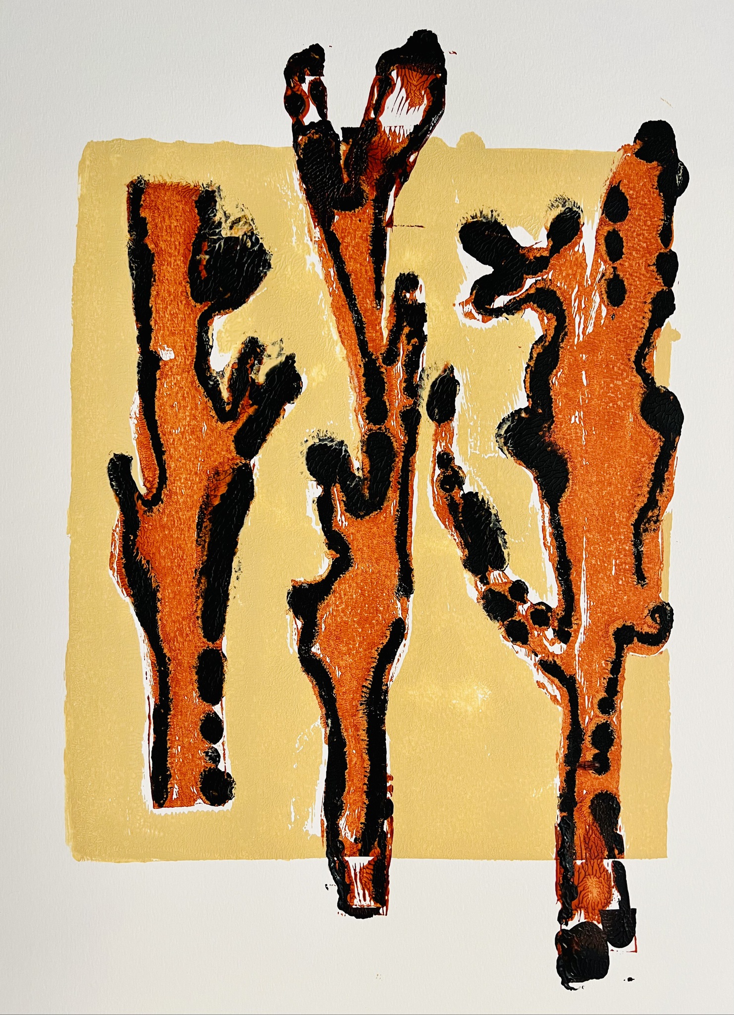 Pruned trees 2 , abstractie van gesnoeide bomen. Omgeving Schoorl voorjaar 2022. Pruned trees, serie Nature. Deze serie bomen zijn geinspireerd op het vroege voorjaar waarin je veel net gesnoeide bomen zien. Nog helemaal kaal, zonder bladeren. Dit inspireerde mij om een serie te maken dmv afdruk tecknieken in acrylverf.