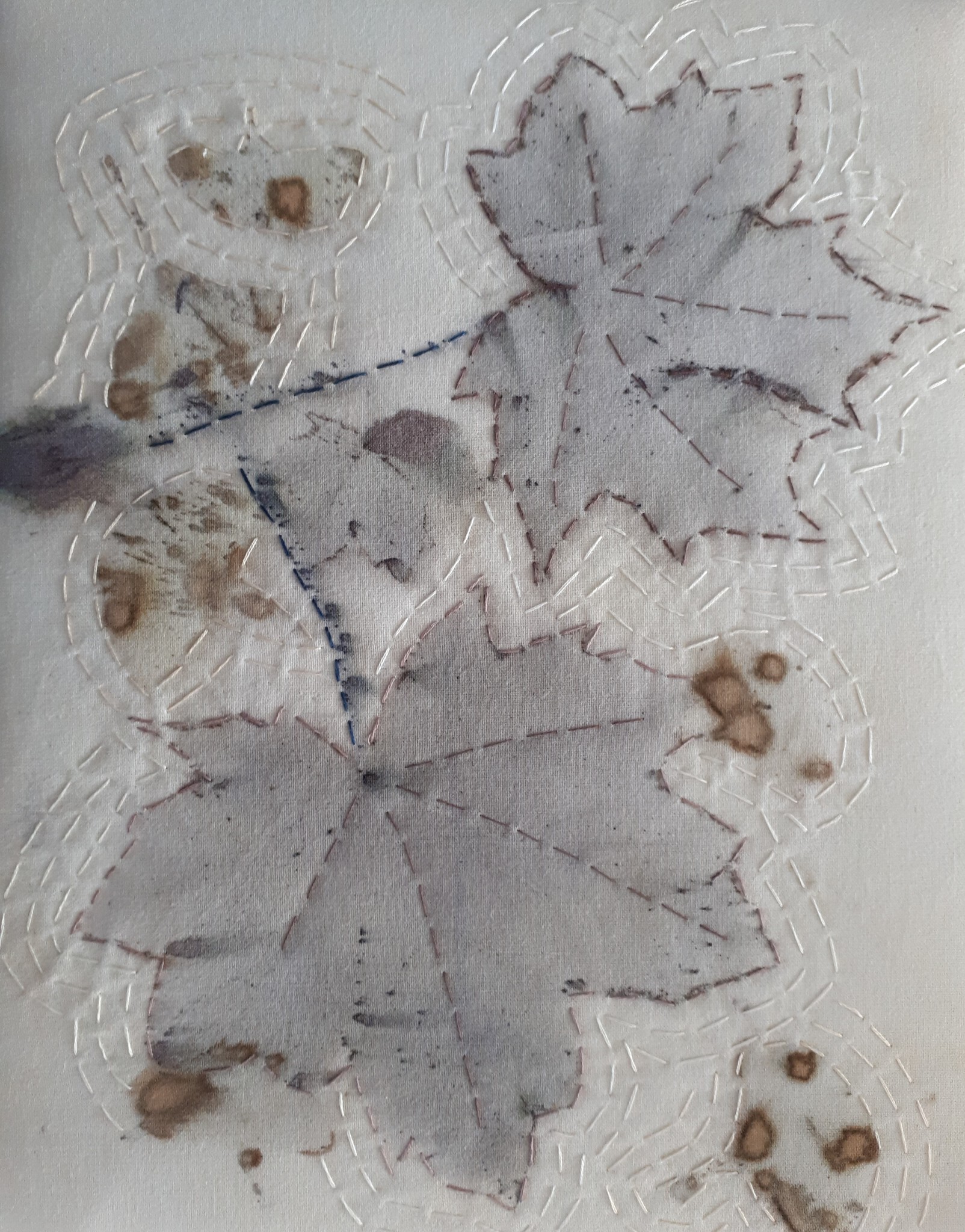 Wanddecoartie van ecoprint op katoen met handborduurwerk. De stof is om een houten frame gespannen. Esdoornblad.