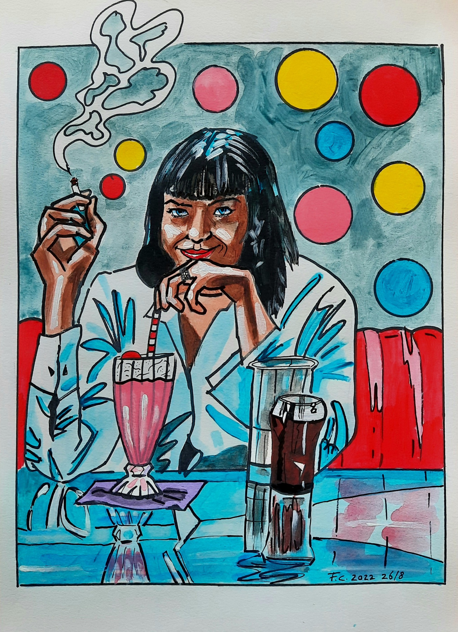 Uitgaan Mixedmedia Popart Film Milkshake Umathurman Pulpfiction Miawallace