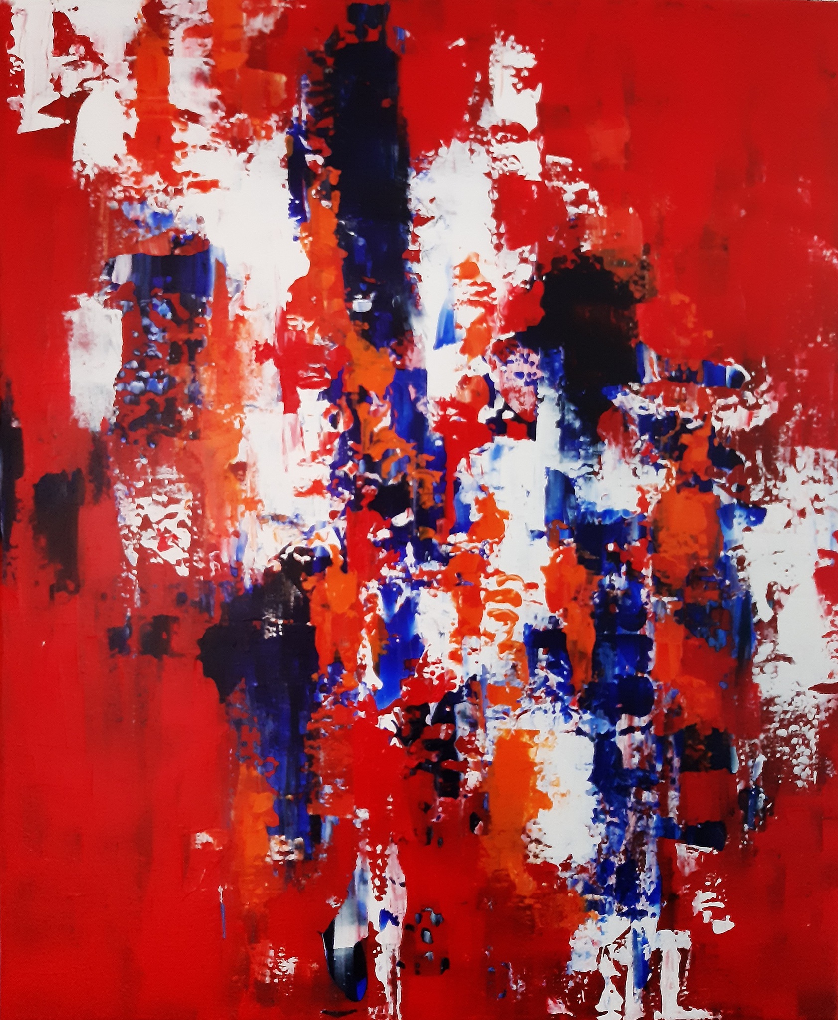 "Passed 2 dutchies...." Abstract acrylschilderij in de kleuren van de nederlandse vlag uitgaande van het rood. Rood, wit , blauw en oranje. (Hoeft niet op de kop :) )