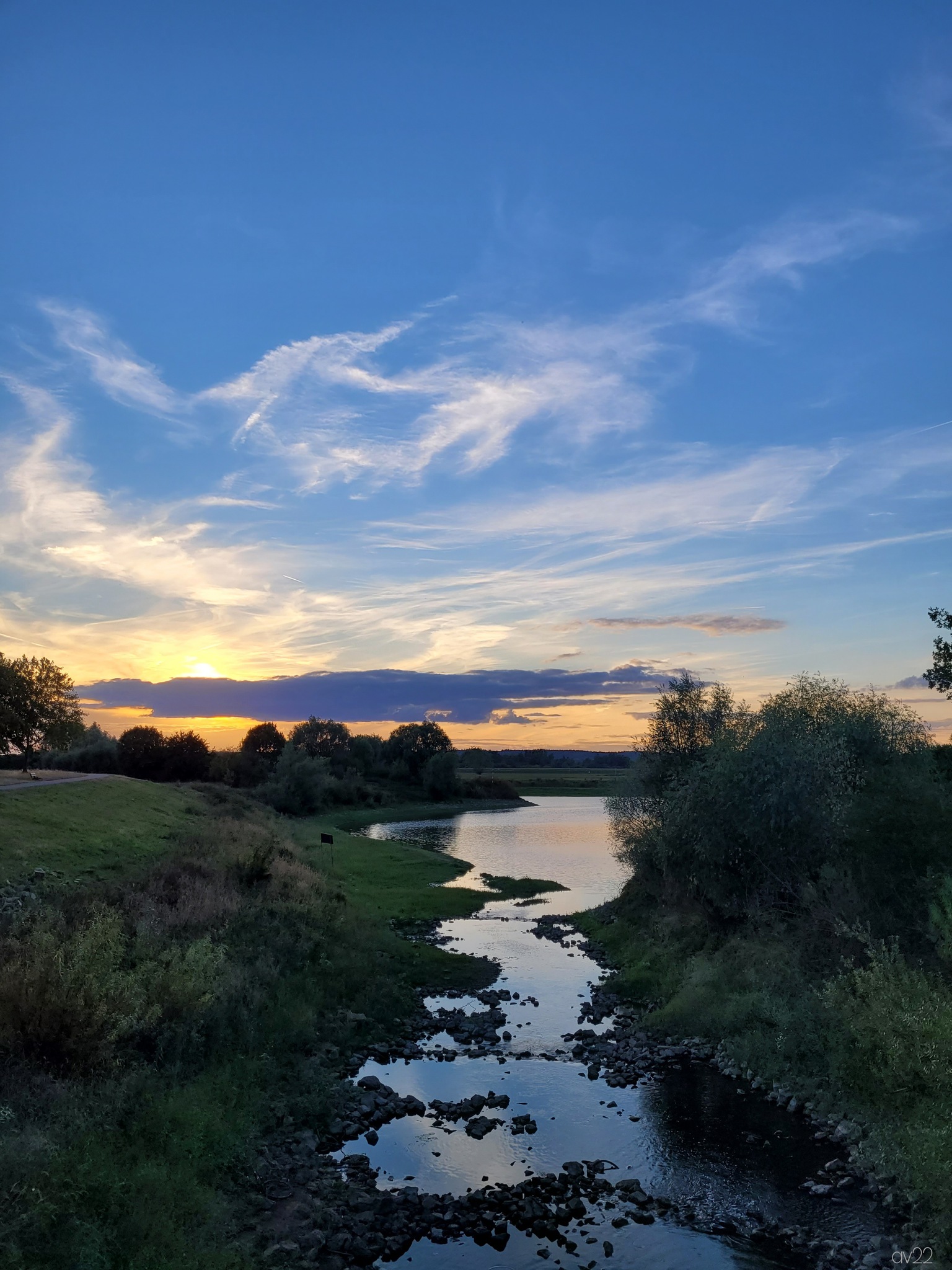 Zonsondergang bij de IJssel bij Doesburg met op de achtergrond de Posbank.