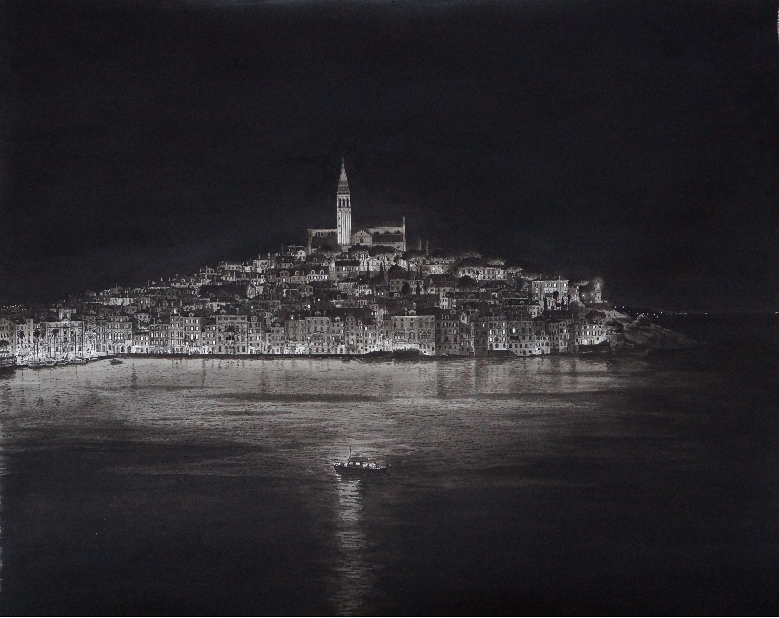 Wit Zee Zwart Art Tekening Kunst Nacht Black White Drawing Realisme Realism Architectuur Architecture Stad City Sea Night