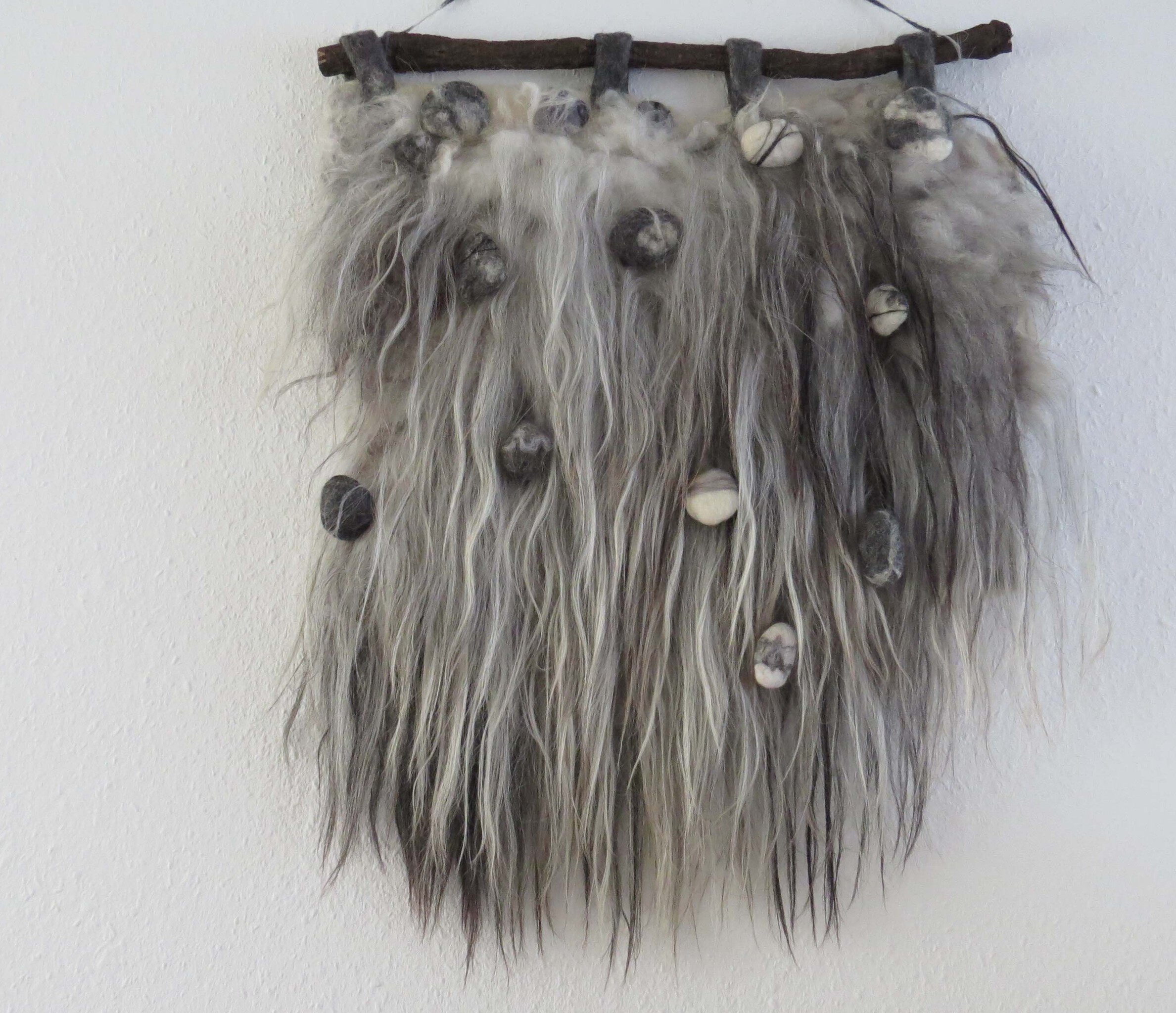 Wolwandkleed van de prachtige wollokken van het Heideschnücke schaap. De natuurlijke kleuren bestaan uit de verschillende grijstinten van bijna wit tot heel donkergrijs. Het wandkleed is bevestigd aan een houten stok en hangt aan een wollen koord. Op het wandkleed en tussen de lokken van de wol zijn gevilte stenen bevestigd (genaaid of hangend aan koordje) De stenen zijn handgevilt in bruin/grijs/witte tinten en hebben een natuurlijke uitstraling. Het wandkleed doet denken aan een steenlawine op een ondergrond van rotsen. De inspiratie hiervoor bestond uit mijn foto's van een vakantiereis naar Noorwegen. 100% natuurproduct. Milieuvriendelijk. Dit product wordt geleverd met gebruiksvoorschriften.