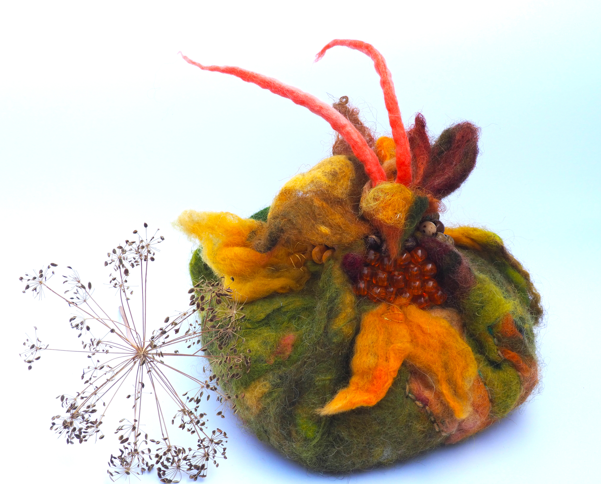 Een wollen pot in zomerse kleuren met een bloemsluiting. De pot is gevilt in diverse kleuren groen, oranje en geel en gedecoreerd met kralen in bijpassende tinten. De pot kan afgesloten worden met een bloemdeksel. Deze vierkante pot is erg decoratief, maar kan ook gebruikt worden voor potpourrie of andere kleinigheden. Omtrek 60 cm Wol is een 100% natuurproduct en is milieuvriendelijk.