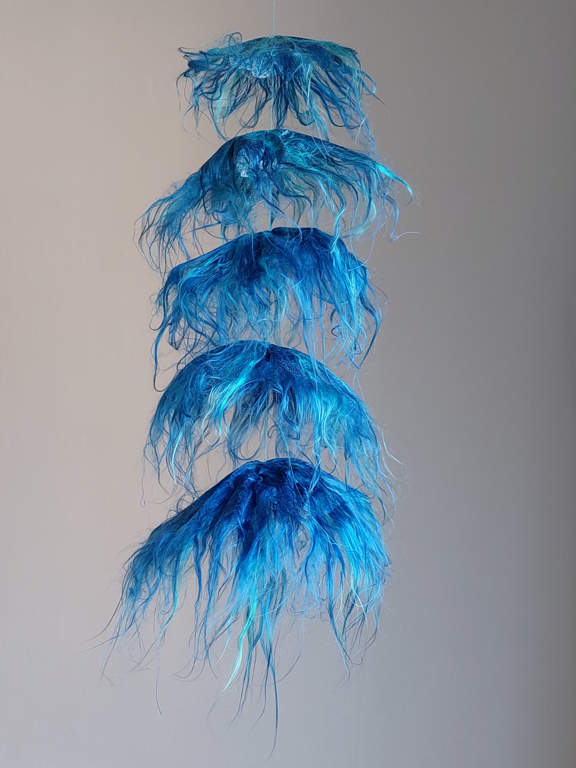 Geinspireerd op de vorm van de kwal is dit hangende werk van Tyvek en zijdevezels voortdurend in beweging onder invloed van luchtverplaatsing.