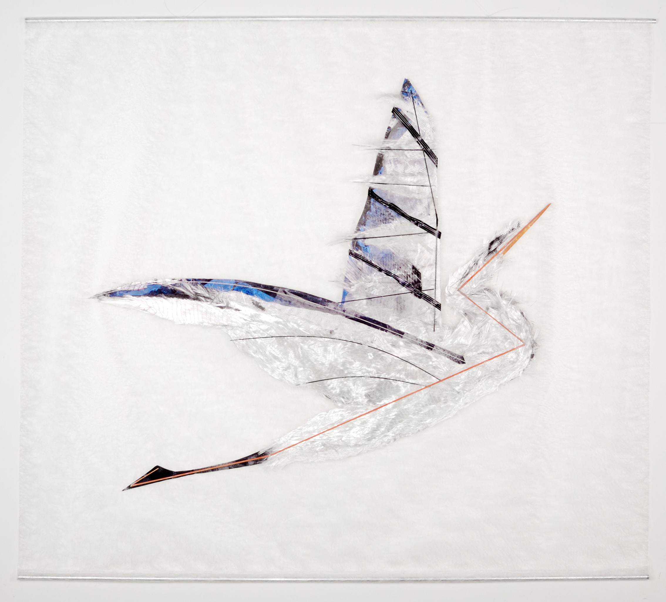 Hangemaakte collage opgebouwd uit diverse materialen, waaronder transparant vlies als ondergrond, dat 5 cm van de muur hangt. Elk werk uit deze serie heeft een originele handtekening in de vorm van een A.