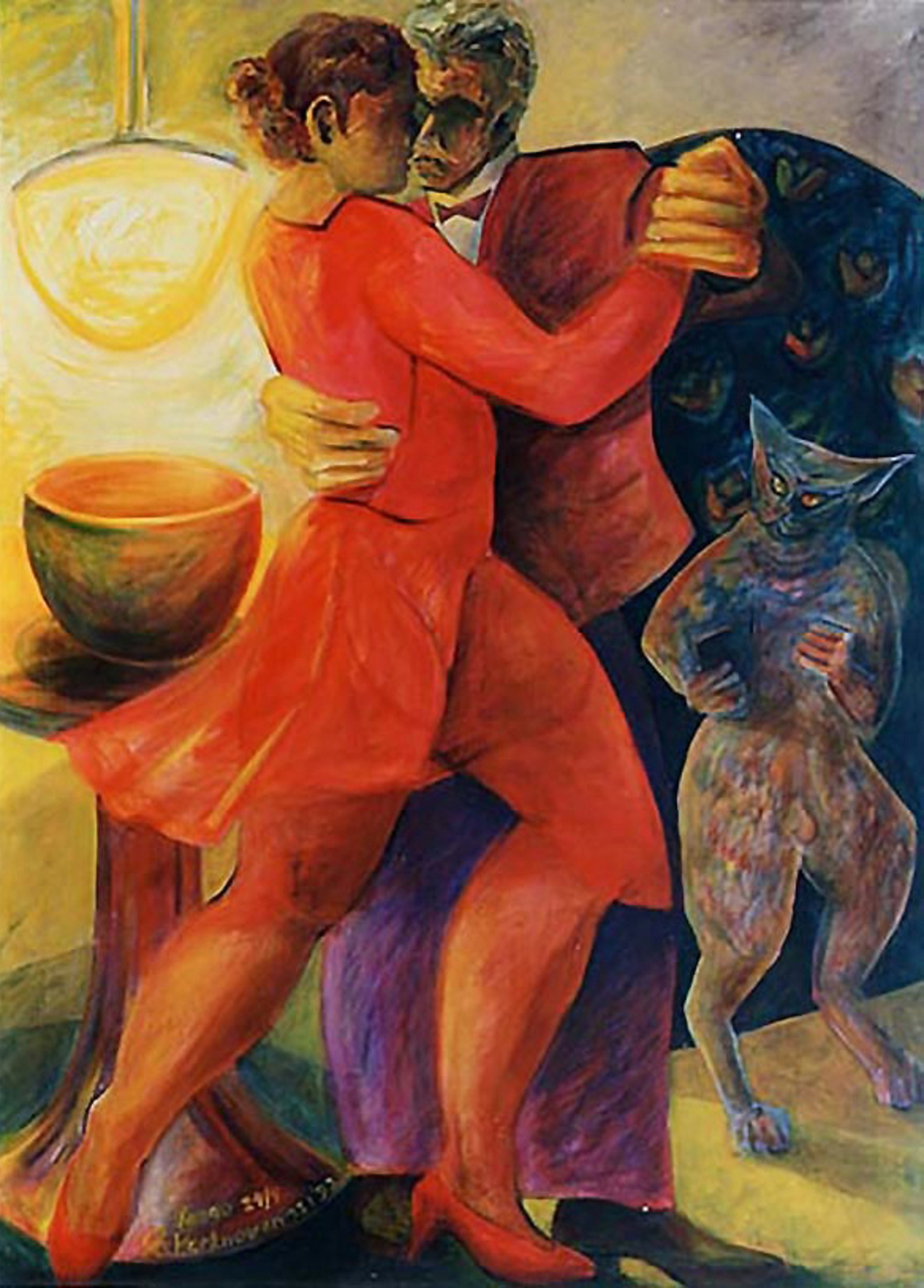 Tango als metafoor voor relatie/paringsritueel, de kat danst mee en is in rijm met de mensen