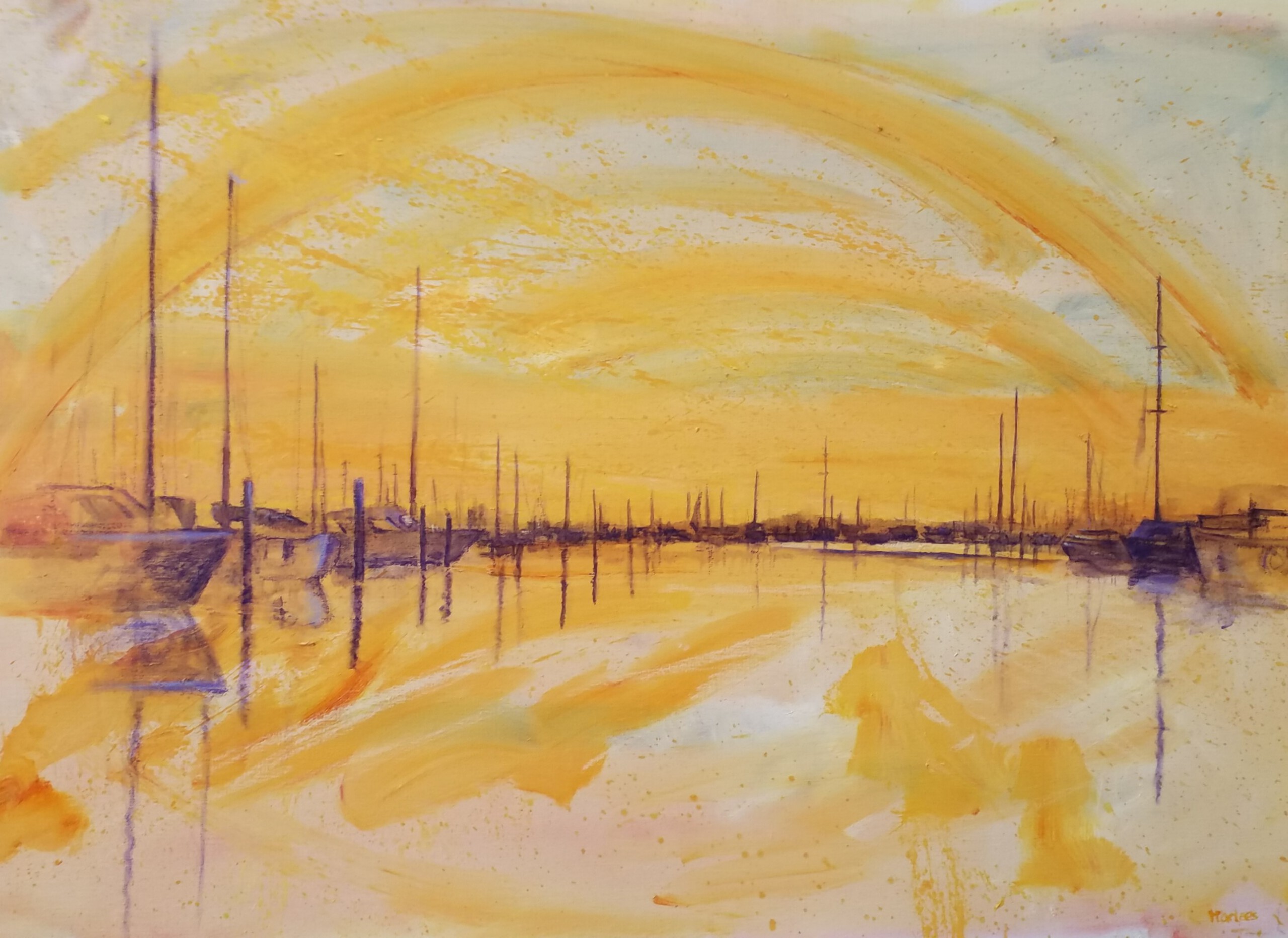 Huis Schilderij Zon Geel Landschap Spiritueel Water Licht Natuur Lucht Aarde Haven Hemel Symboliek Brug Verbinding Varen Boten Spiritualiteit Thuis Bridge Connection Connector Verbinder Haeven