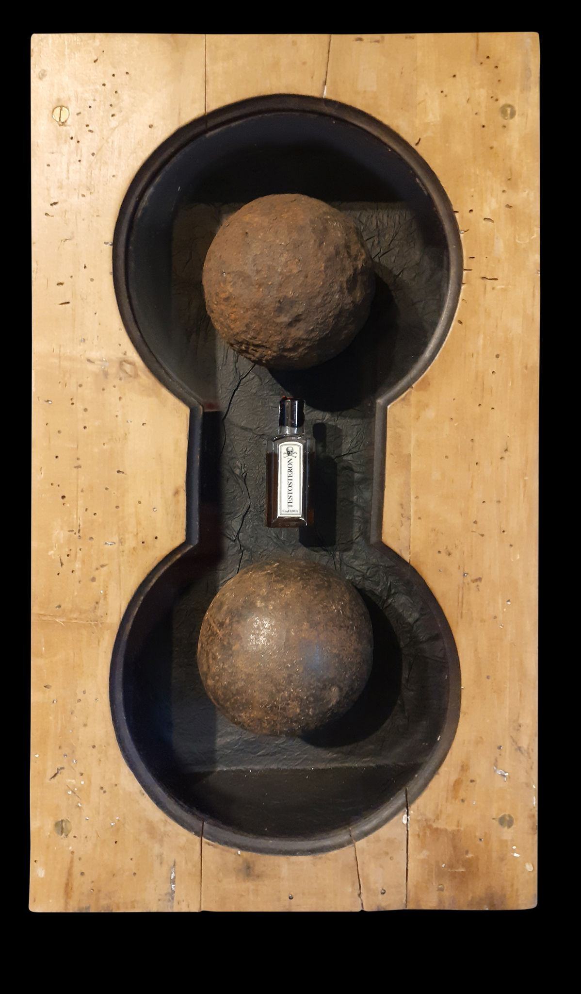 Oude klokkast met flesje 'testosteron' gecentreerd tussen een kanonskogel (1799) en stootkogel (recent).