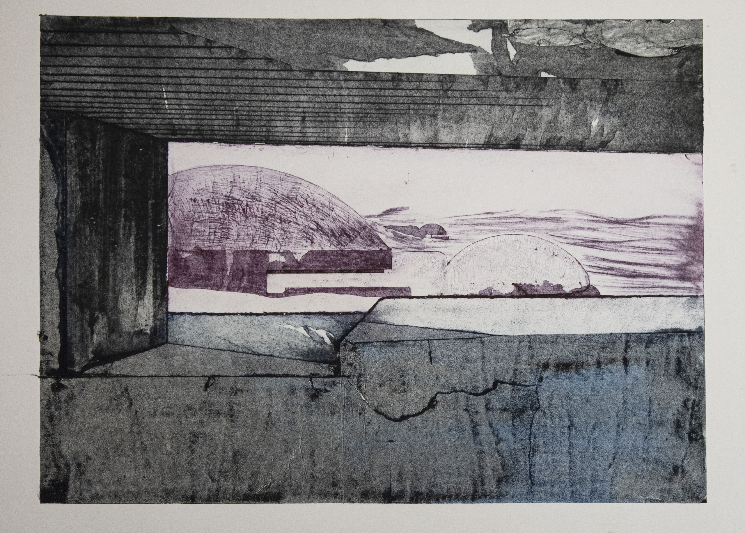 In mijn jeugd ik heb aan de kust gewoond, bunkers op fiets afstand, waar werkelijkheid en fantasie voor mij een nieuw verhaal maakte. Spannende 2de WO geschiedenis gezien door kinderogen, mix van fantasie, voorstellingsvermogen en avontuur. Nog steeds fascineert mij deze schuil en verdedigingsarchitectuur, meter dikke gewapend betonnen muren, bijna onverwoestbaar, met hun vuurspuwende vizier. Dit werk is kartongravuredruk vrij zeldzaam en in kleine oplage.
