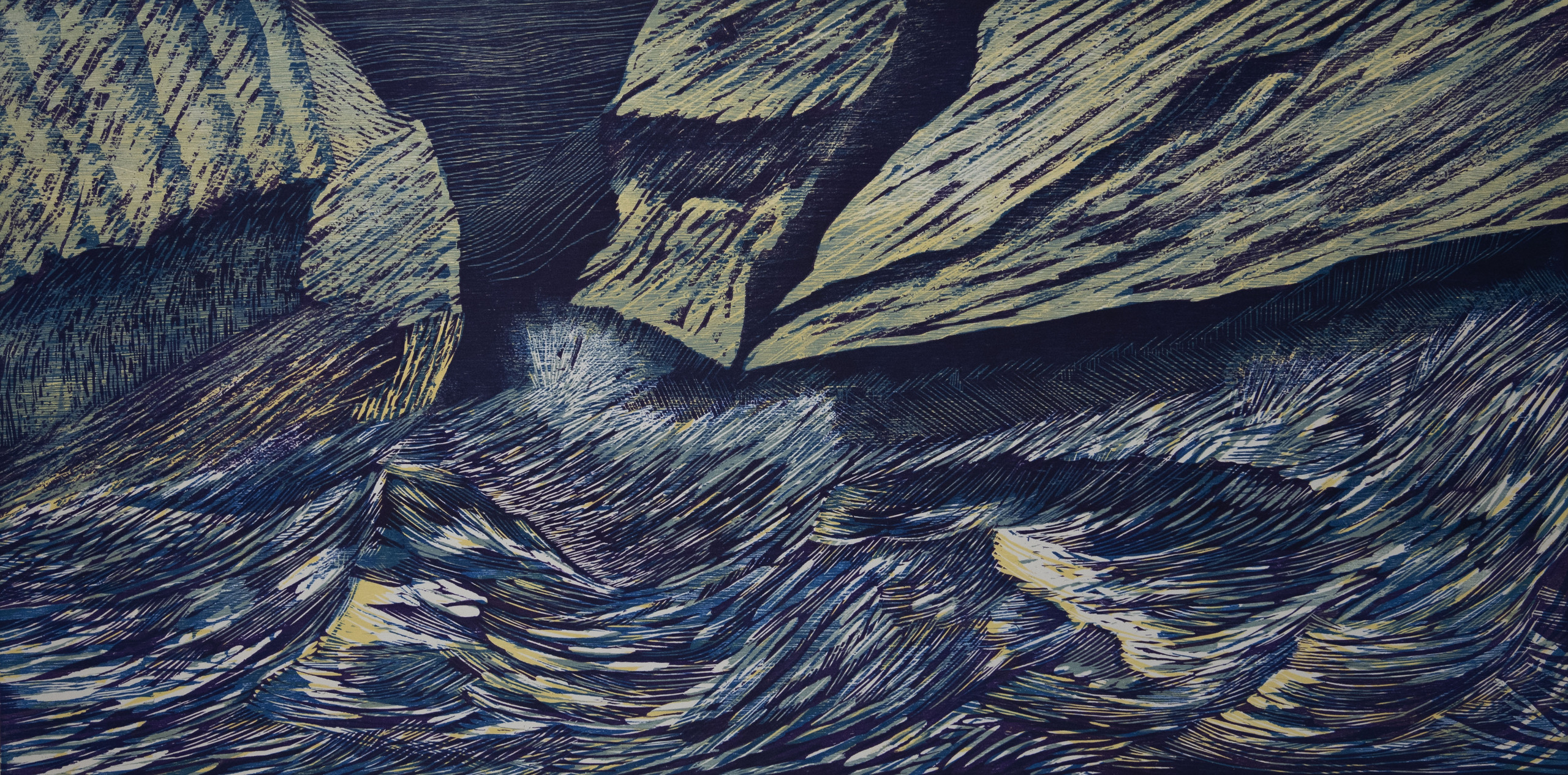 In meer kleurendruk houtsnedeprent leg ik de meedogenloze zee uit. Indifferent aan welke menselijke ingreep ook, ze veranderd haar koers in alle grilligheid. Brullend tegen bezwijkende kusten water staat nooit echt stil, tenslotte heeft water alle tijd van de wereld. Slijpt. beukt waar het zo uitkomt, onder invloed van andere natuurreuzen: maan wind zon en als maar uitdijende ruimte.
