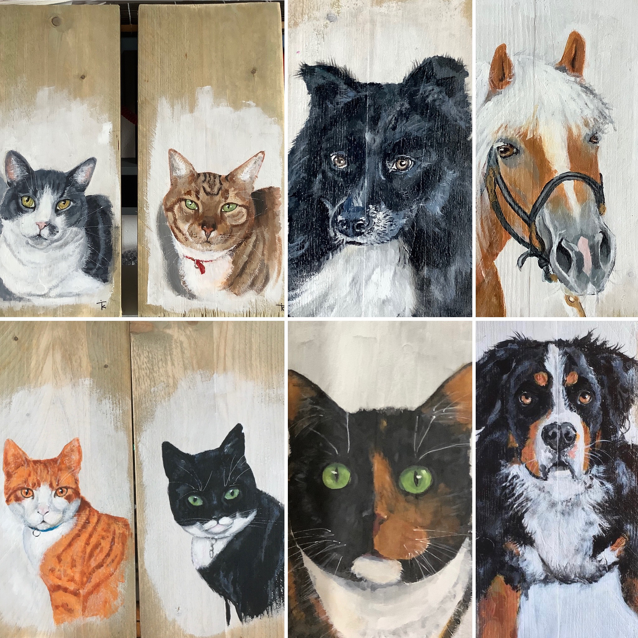 Ik schilder portretten van huisdieren en paarden op steigerhout.