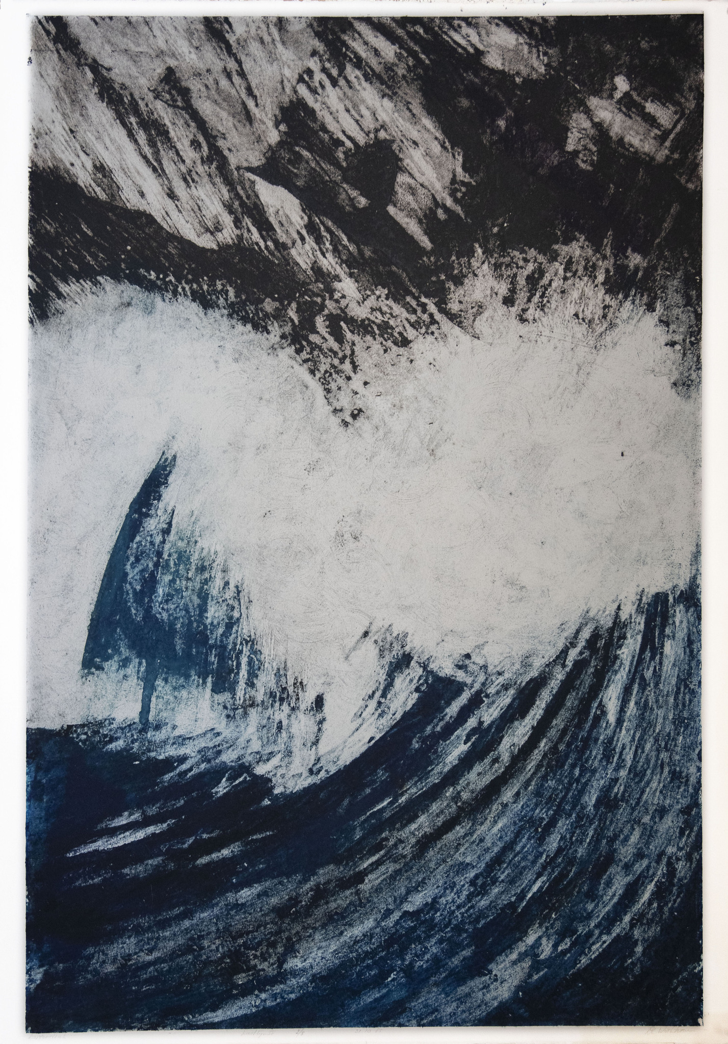 In kartongravuredruk leg ik de meedogenloze zee uit. Indifferent aan welke menselijke ingreep ook, ze veranderd haar koers in alle grilligheid. Brullend tegen bezwijkende kusten water staat nooit echt stil, tenslotte heeft water alle tijd van de wereld. Slijpt. beukt waar het zo uitkomt, onder invloed van andere natuurreuzen: maan wind zon en als maar uitdijende ruimte. Kartongravures zijn in kleine oplage en nog beperkt beschikbaar. Kustlijn 5 nog 4 exemplaren beschikbaar. Deze prenten hebben een lichte verkleuring in het papier.