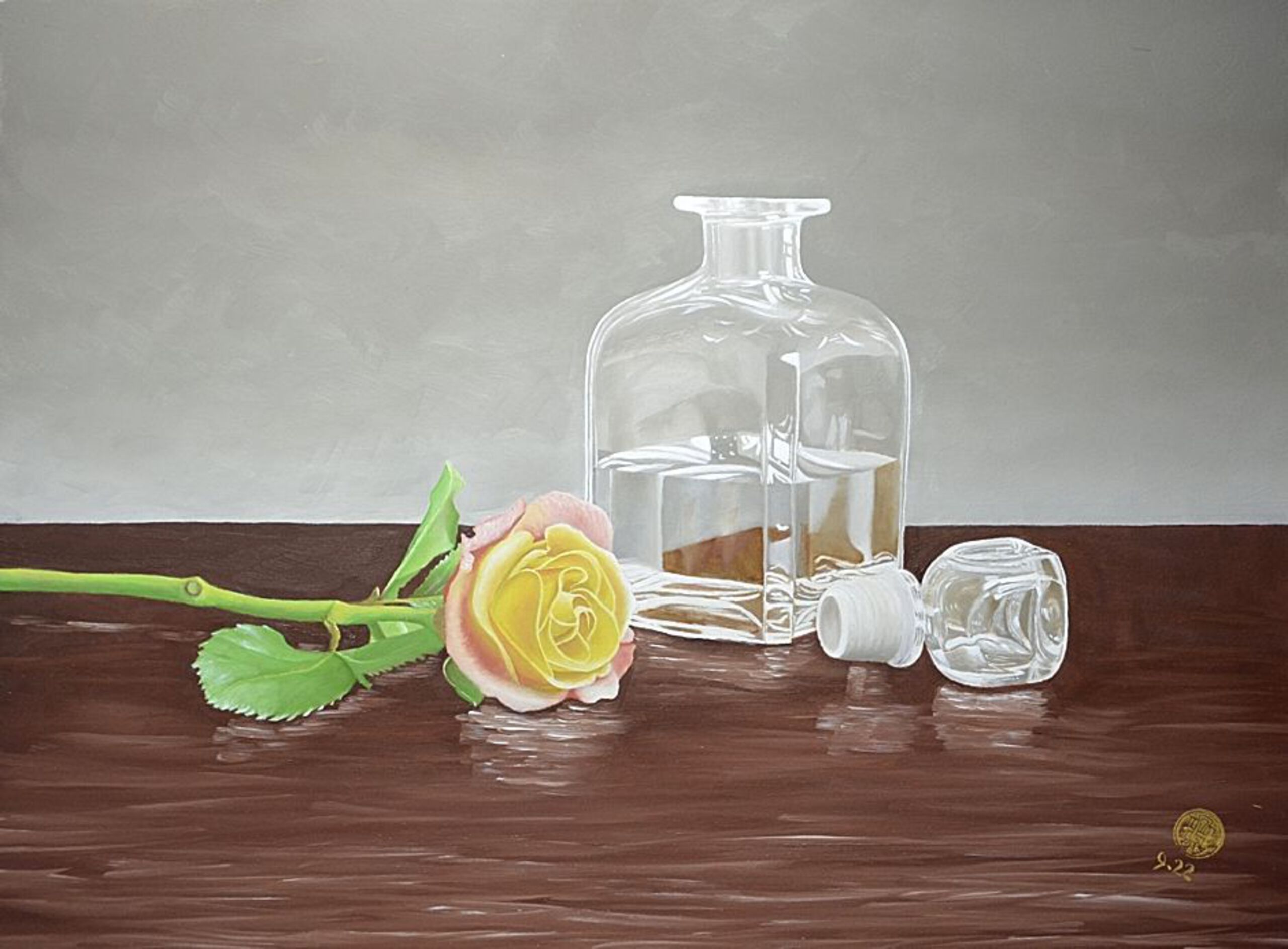 Karaf met Roos Olieverf op paneel 40 x 30 cm, september 2022.