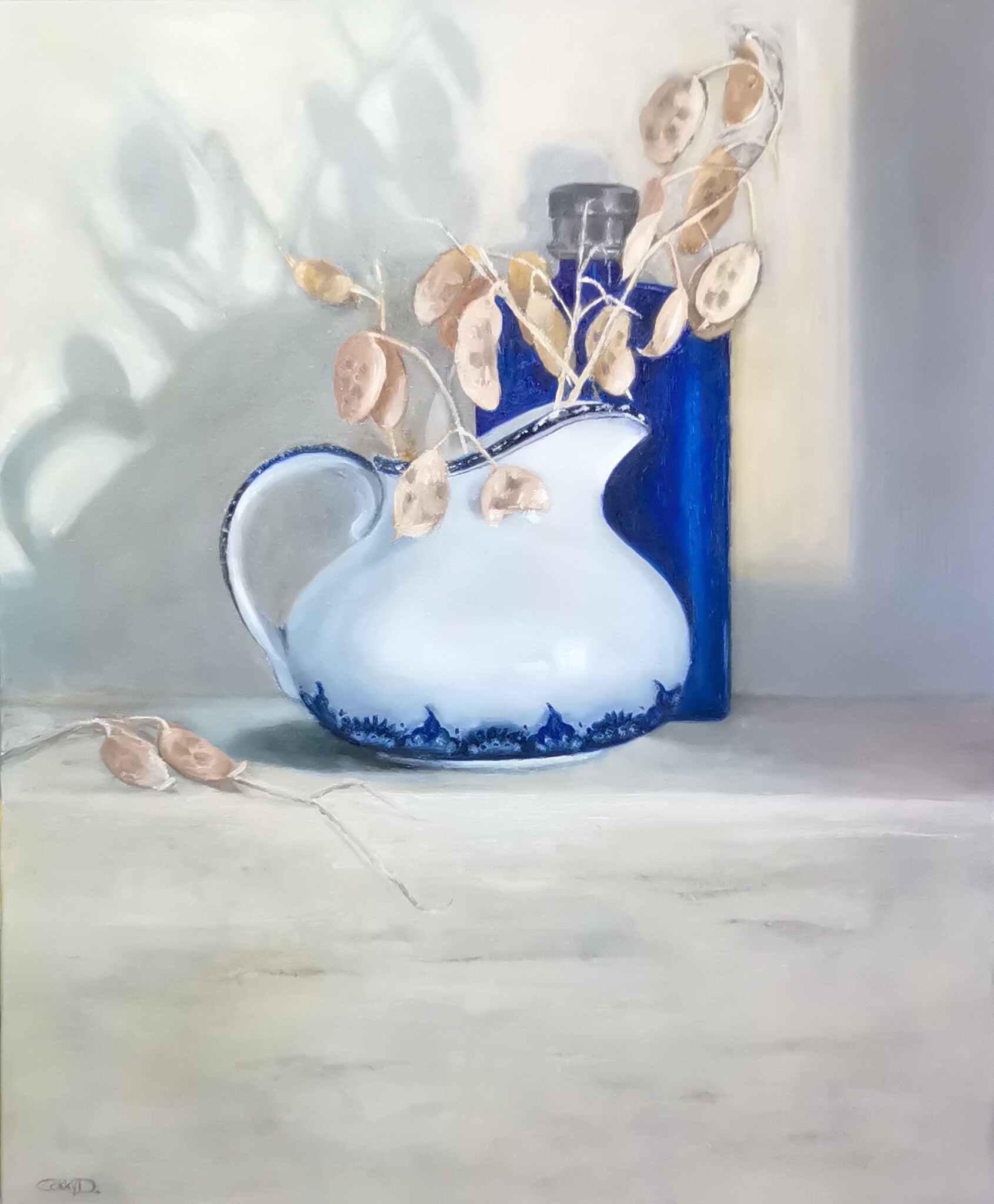 Figuratief Blauw Realistisch Olieverf Doek Fles Oud Kan Muur Schaduw Judaspenning
