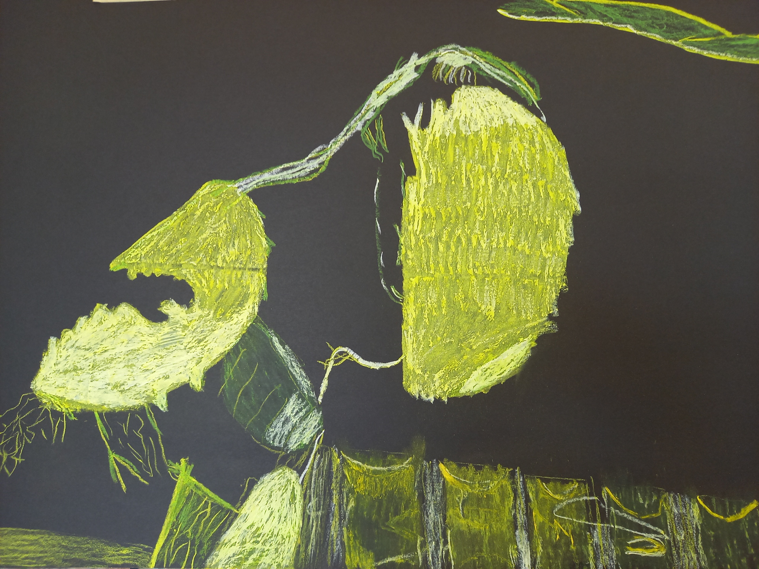van een röntghenfoto maakte ik deze tekening met oliepastels op zwart papier