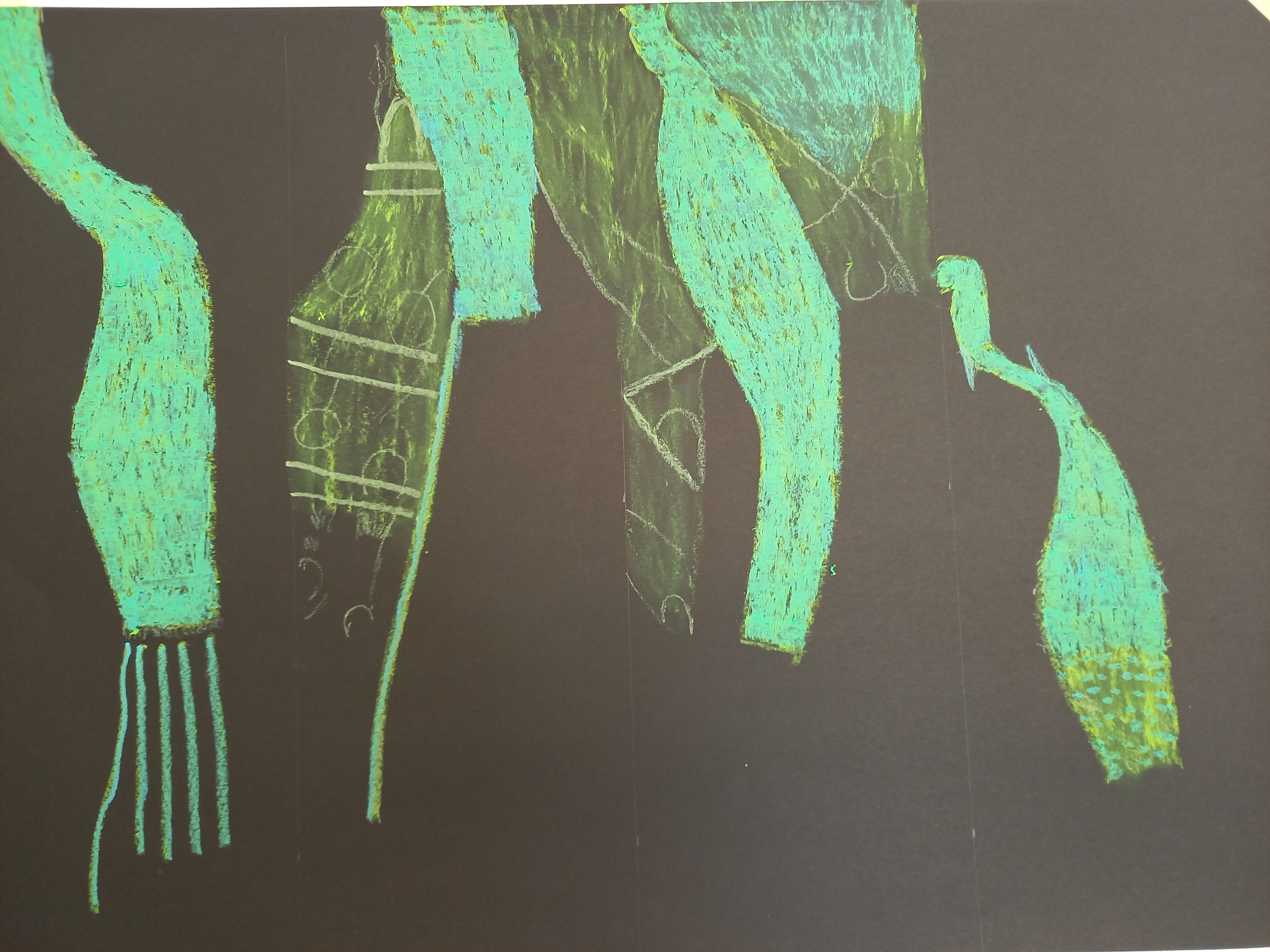 met een röntghenfoto als idee maakte ik deze tekening met oliepastels op zwart papier