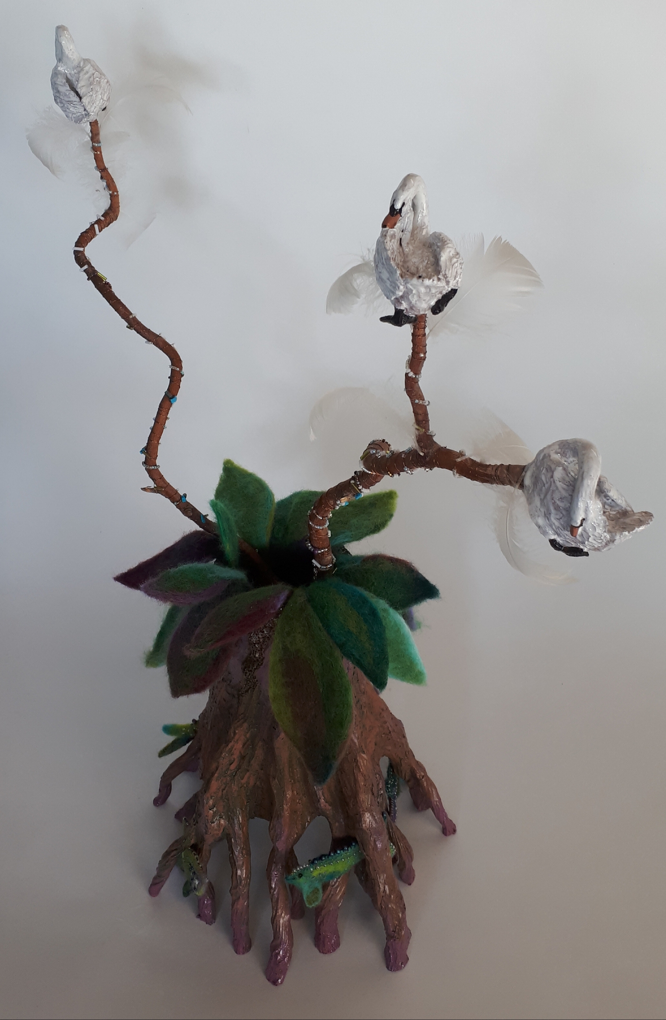Saskia Van Aubel maakt keramische werkstukken, schilderijen, tekeningen en bloemobjecten van textiel.