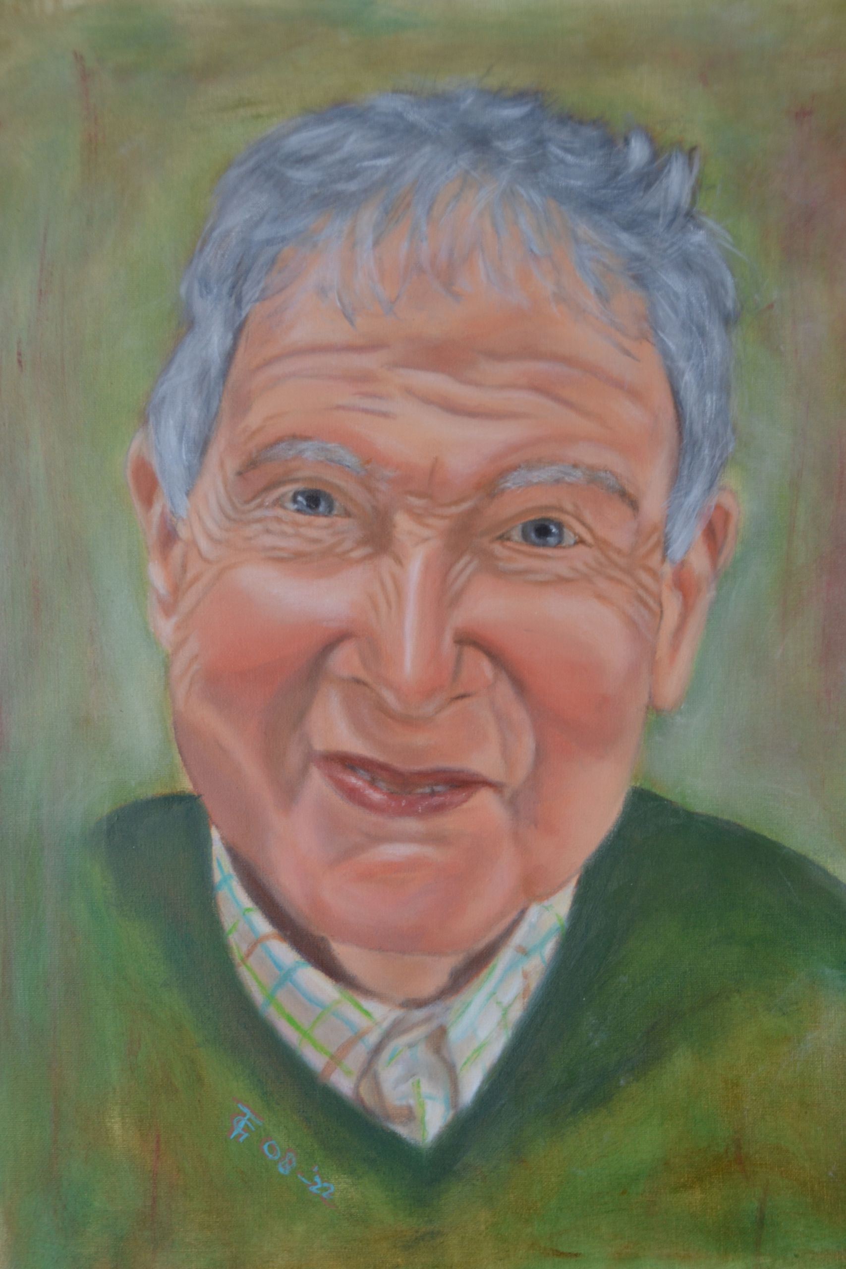 Opdracht. Deze man wordt binnenkort 70 jaar. Dit doek gaat zijn cadeau worden.