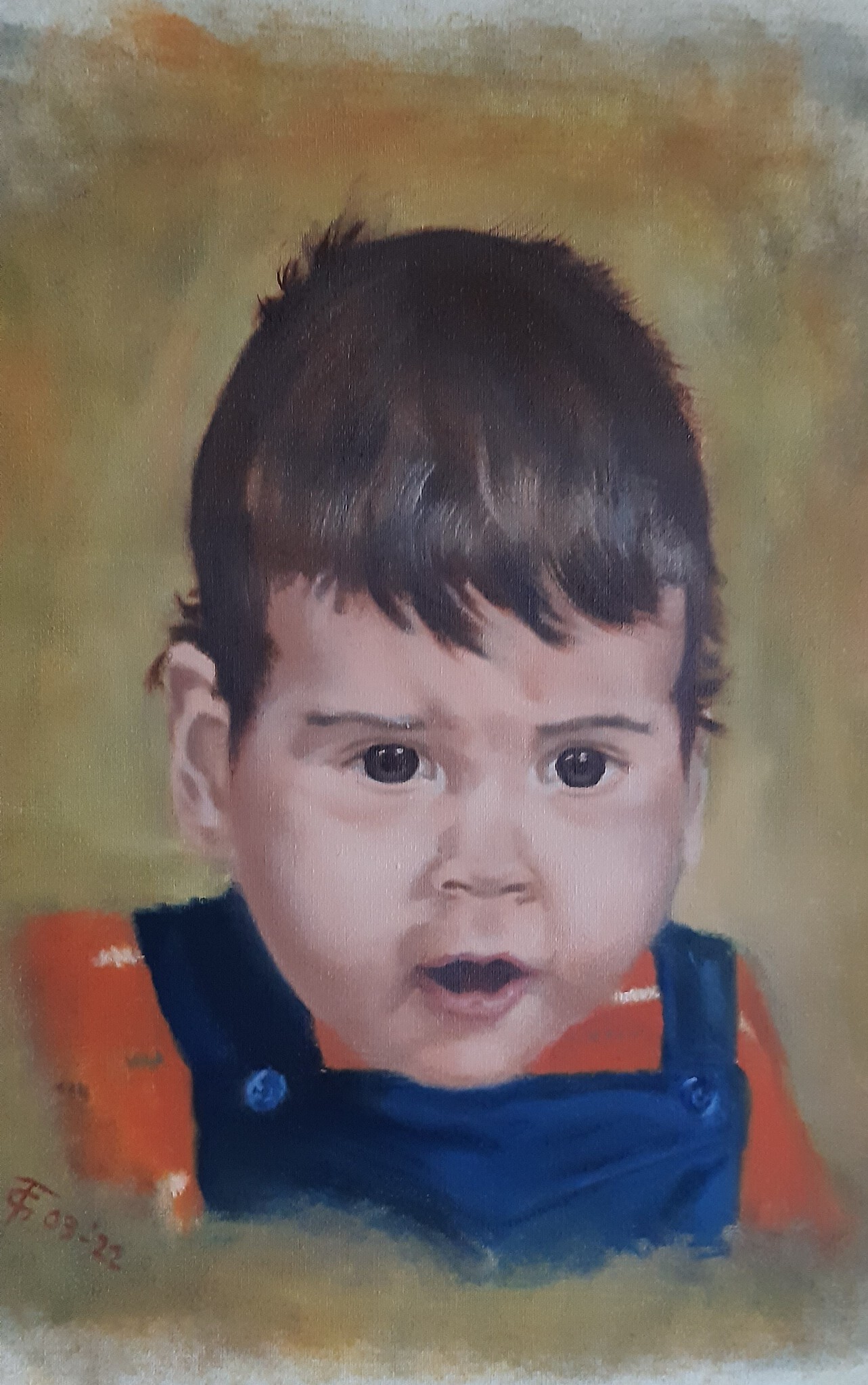 Portret van overleden persoon op linnen doek. Leeftijd afbeelding: 9 maanden