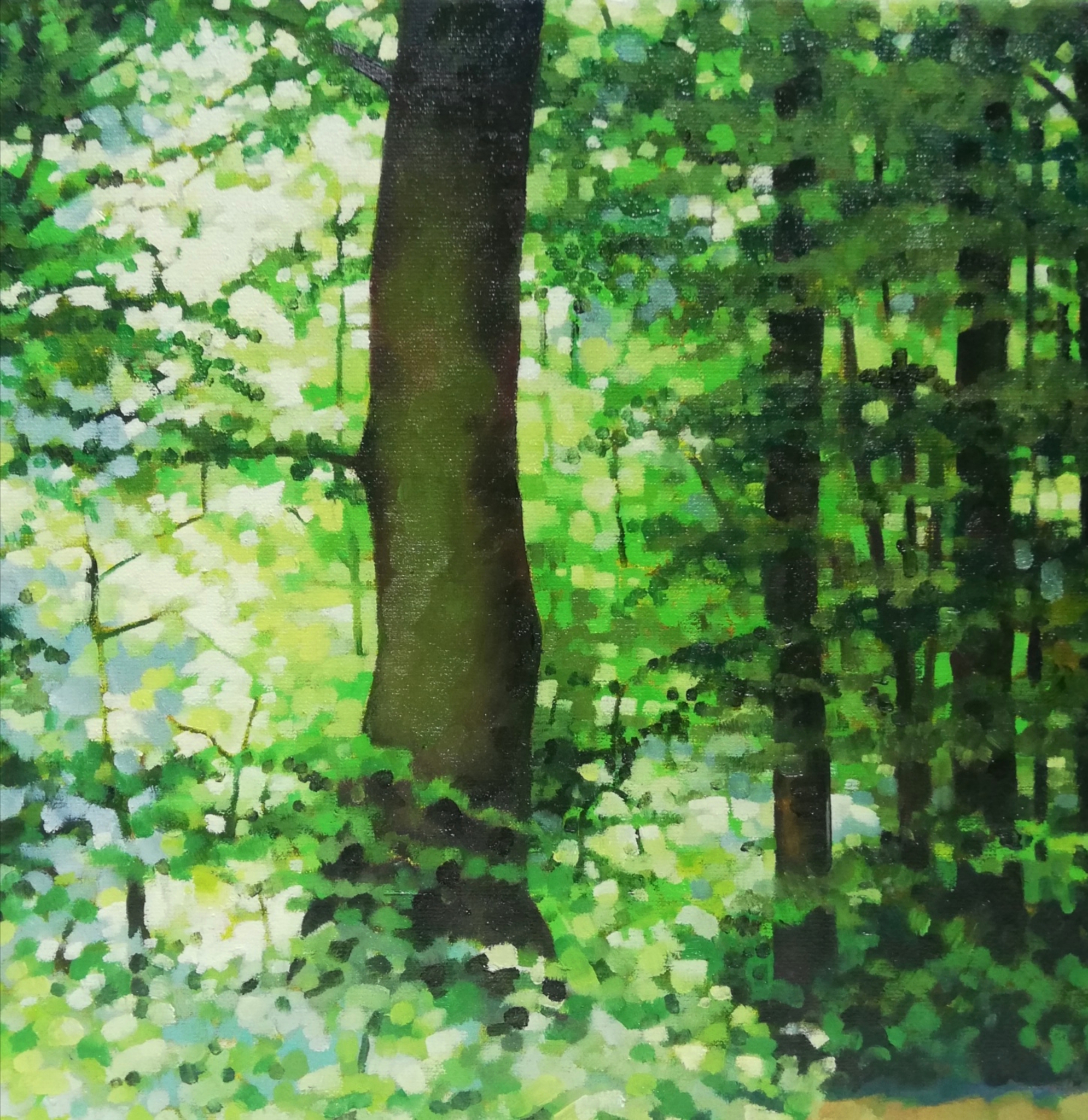 Ik ben gefascineerd door het licht dat in een bos door de bladeren valt. Het levert een voortdurend wisselend beeld op van licht en schaduw. Dit schilderij is een impressie van een bos in het voorjaar in de Eifel.
