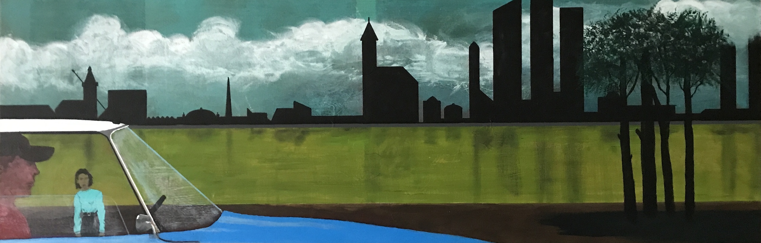 Ik schilder met acryl op doek met soms architectonische achtergronden. Met de menselijke figuren die ik erin aanbreng (geschilderd of als collage) probeer ik een verhaal te vertellen.