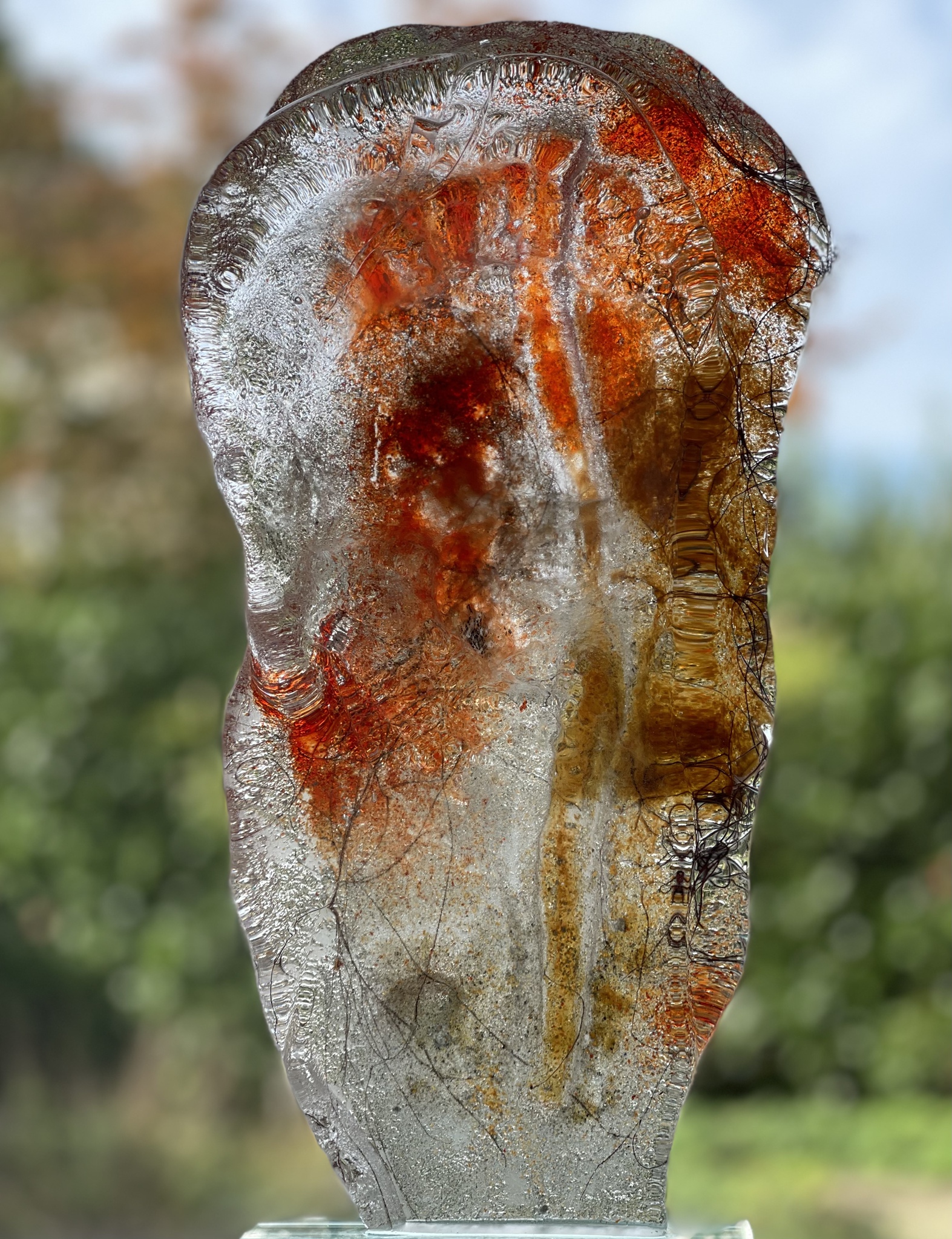 Abstract werk in zand gegoten glas met koperdraad.