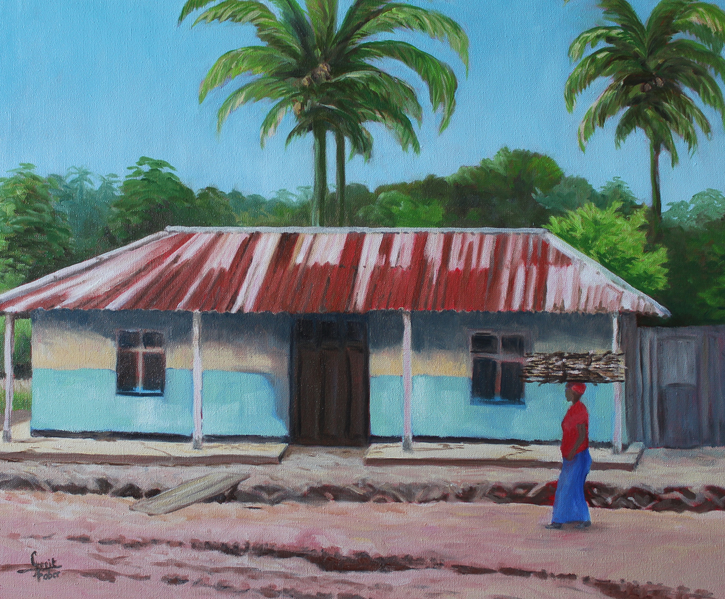 Dorpsgezicht met huis en vrouw die brandhout draagt