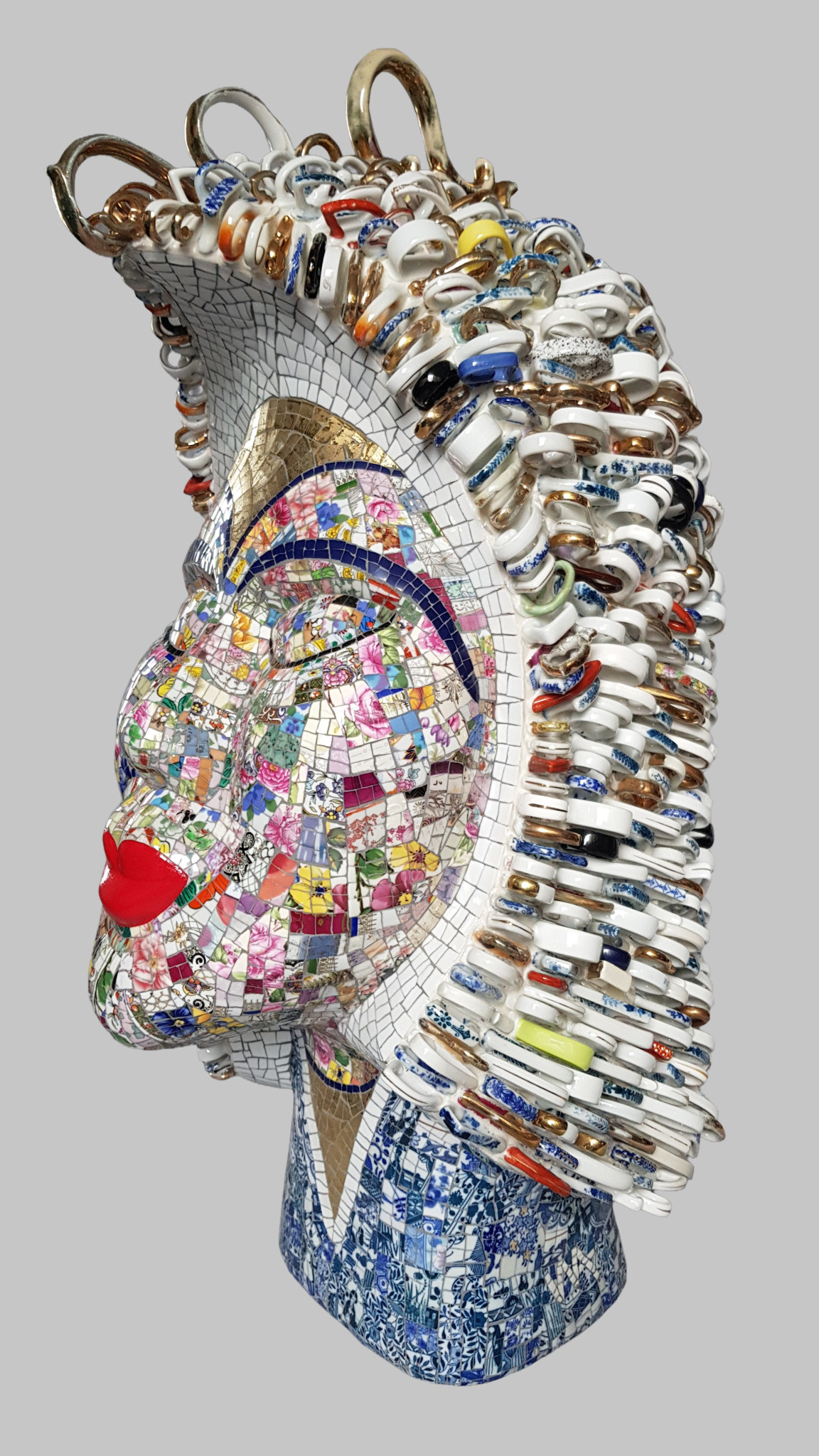Op deze porselein sculptuur heb ik 864 porseleinen oortjes verwerkt met opnieuw een ROOD ACCENT ( de lippen ) De basis voor deze sculptuur heb ik gemaakt van diverse materialen: o.a. polystyreenschuim, glasvezeldoek en kunsthars en andere " geheime " lagen. Daarna beplakt met scherven porselein uit de kringloop en 864 oortjes. Alle oortjes zijn aan weerszijden glad geslepen. Daarna is de sculptuur ingevoegd en opgepoetst. Volledig Handmade / UNICA. Deze is NIET te koop !
