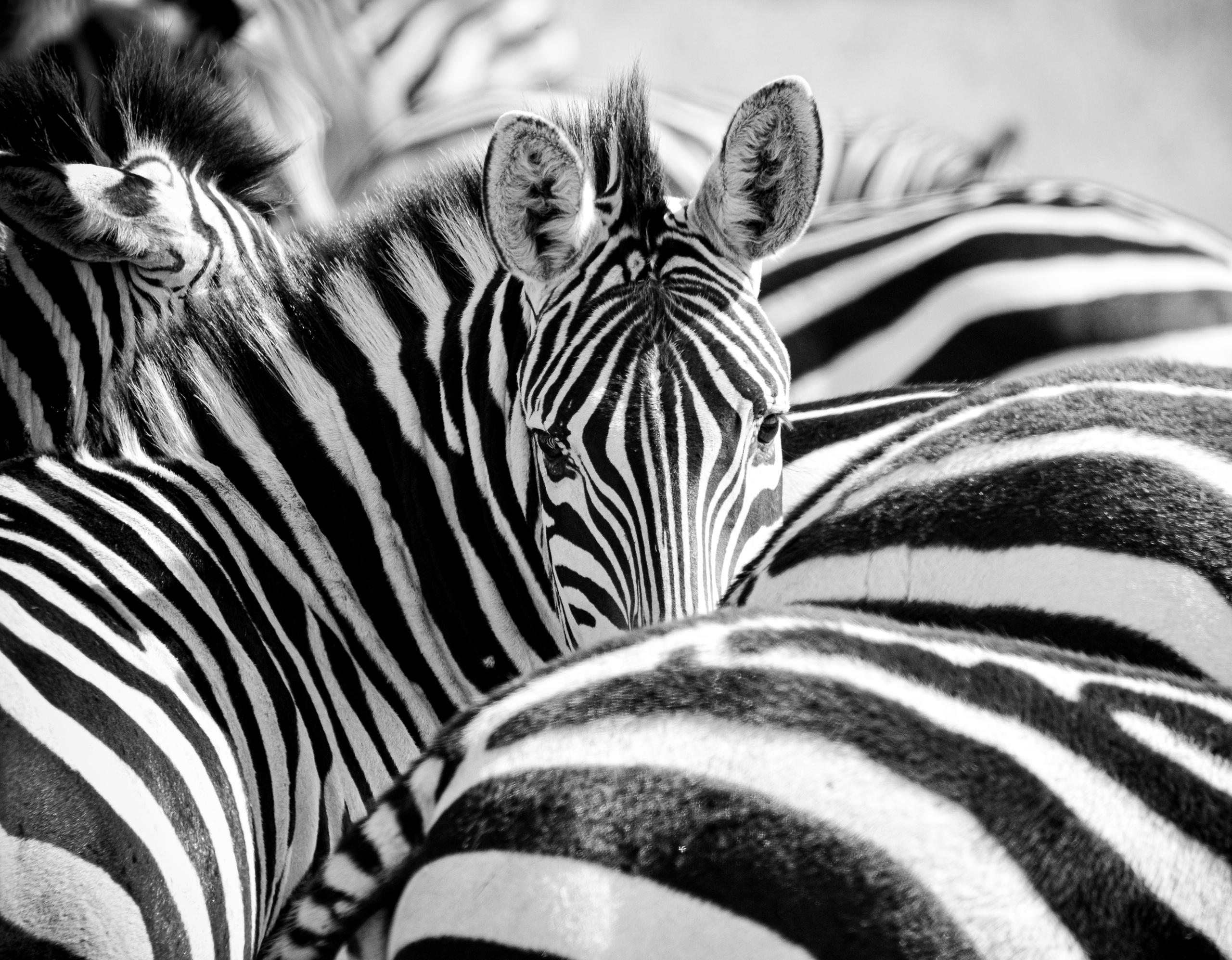 close up zebra in kudde in zwartwit