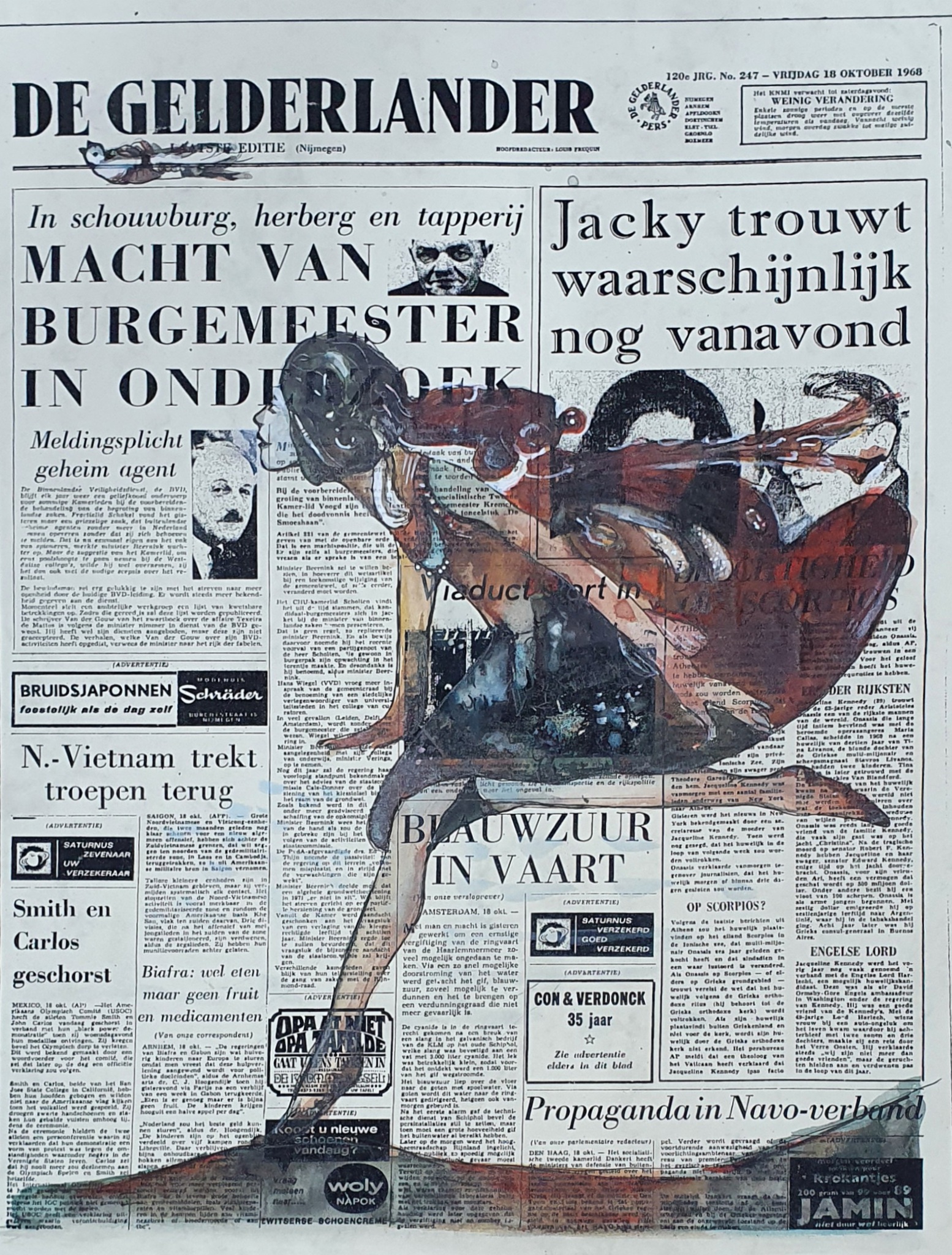 Tekening op oude krant, in acrylinkt , naar een oude foto van een glas in loodraam. Van B Midderigh-Bokhorst 1917. Ingelijst in zwarte lijst.