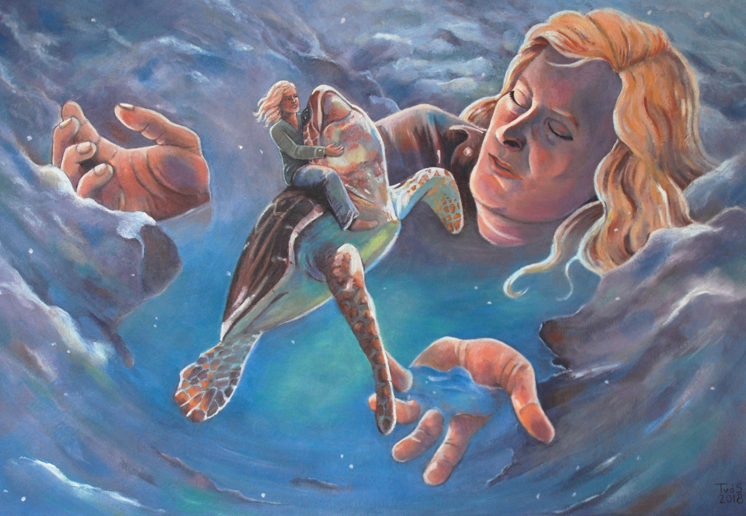 Portret van een man die droomt over grootse avonturen. Op het werk vliegt hij door de lucht op de rug van een schildpad over een prachtig berglandschap. Zijn echte wereld vervaagt en maakt plaats voor die van zijn dromen.