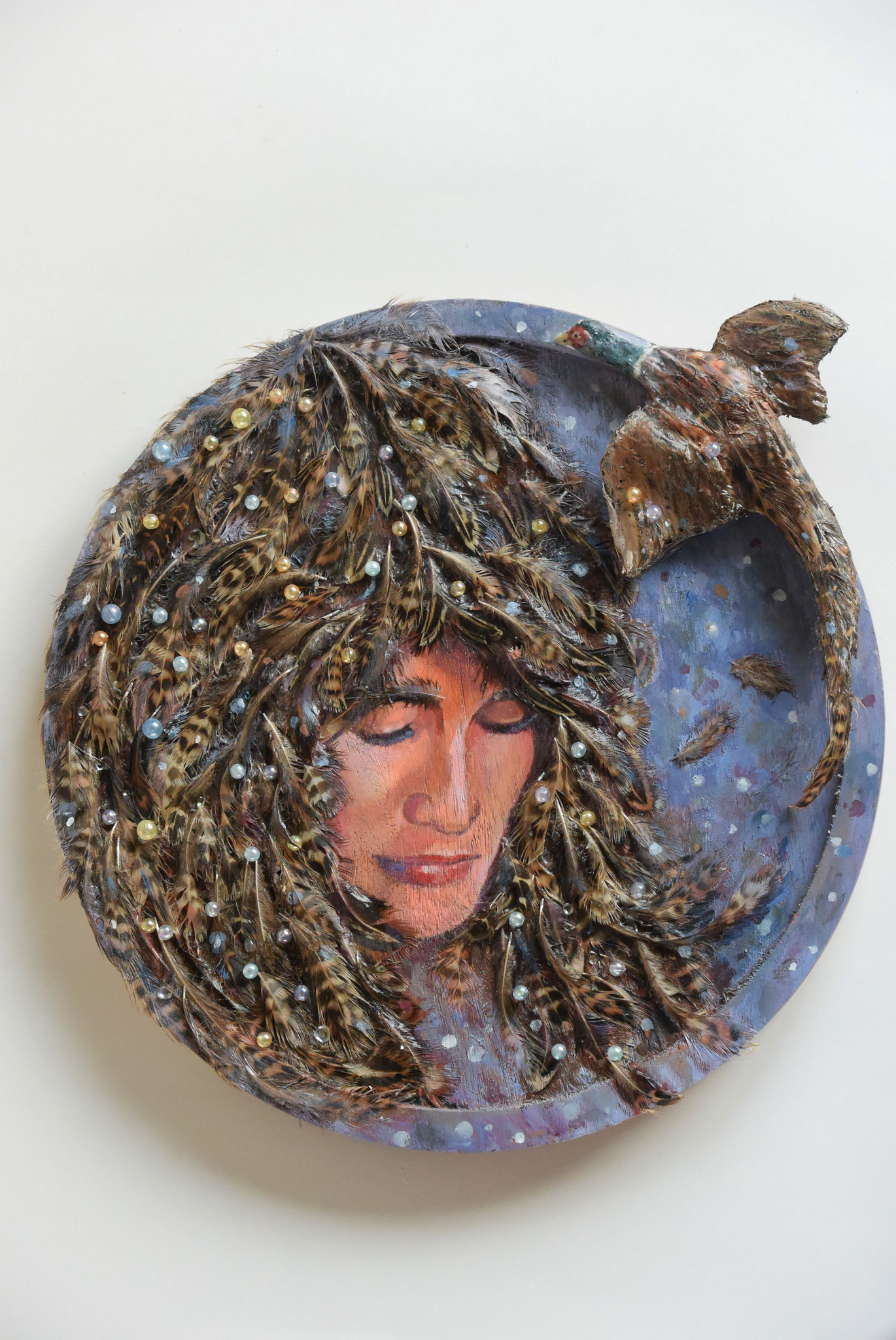 Portret van een jonge vrouw. Haar haren zijn gemaakt van fanzantenveertjes en er vliegt zelfs een fazant uit haar haren weg.