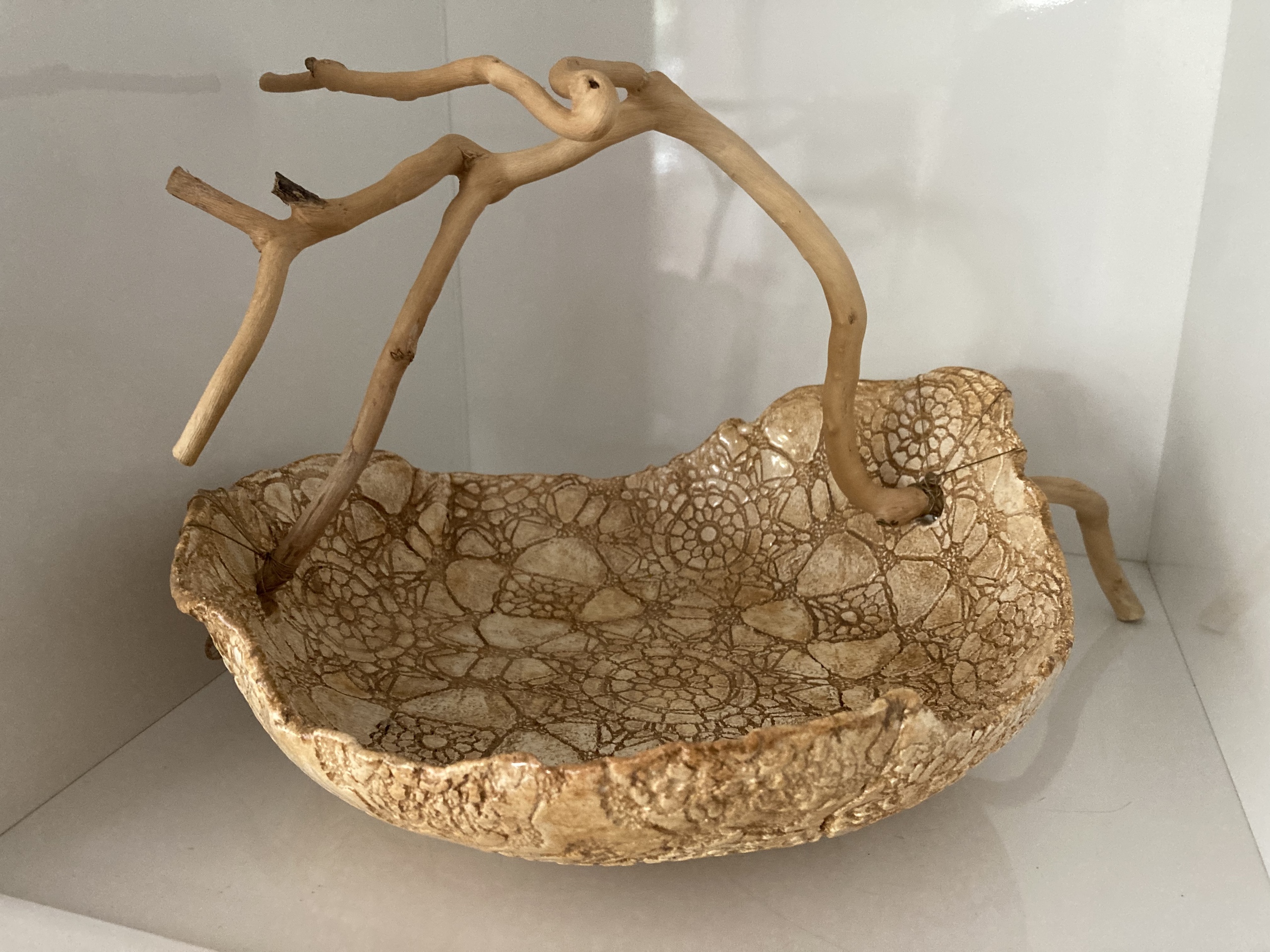 Een geglazuurde gele keramieken schaal met houten handvat. Mooi bloemen motief erin aangebracht.
