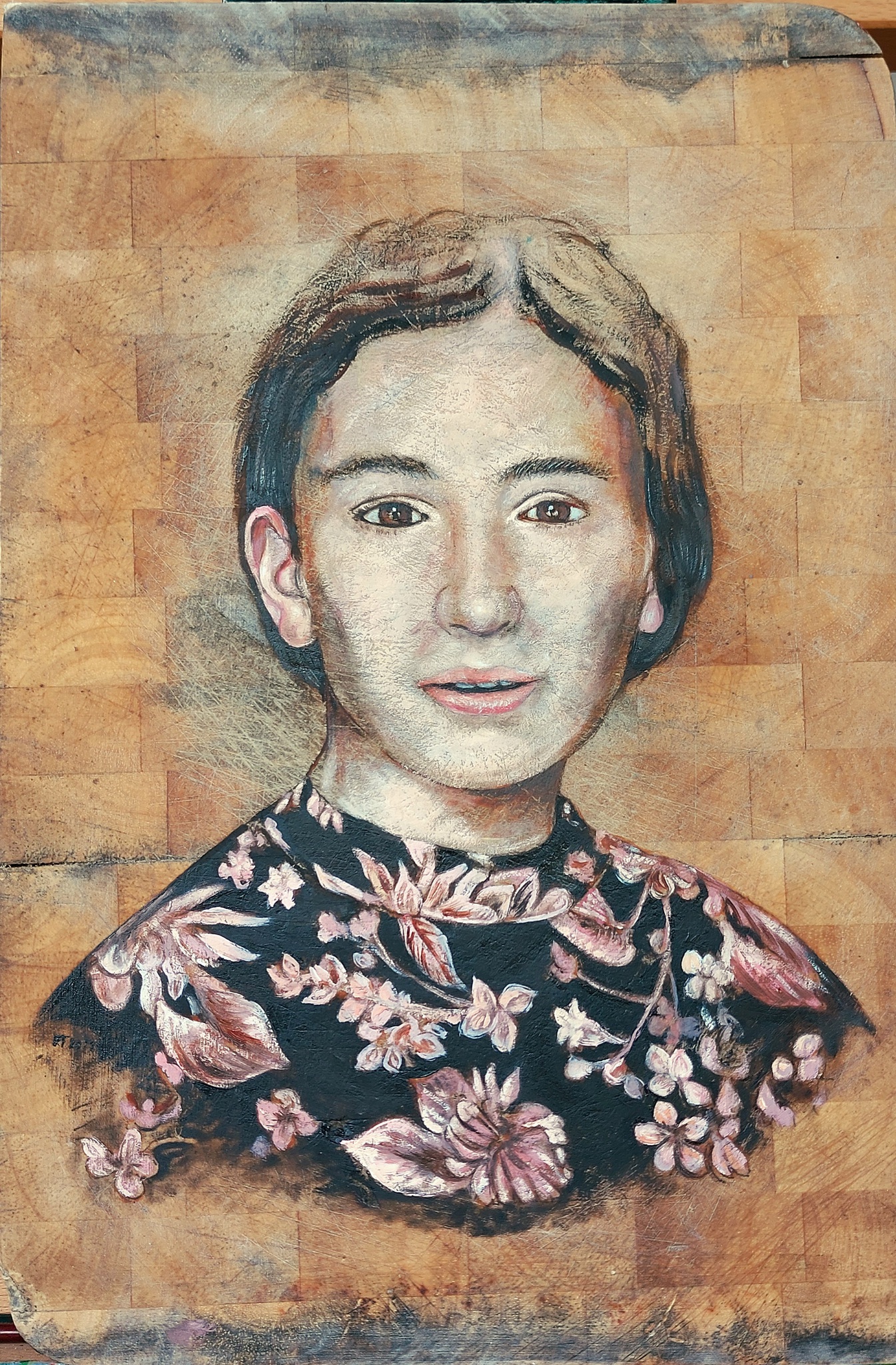Een verstild en ingehouden portret, gebaseerd op een foto in de krant, geschilderd op een oude snijplank.