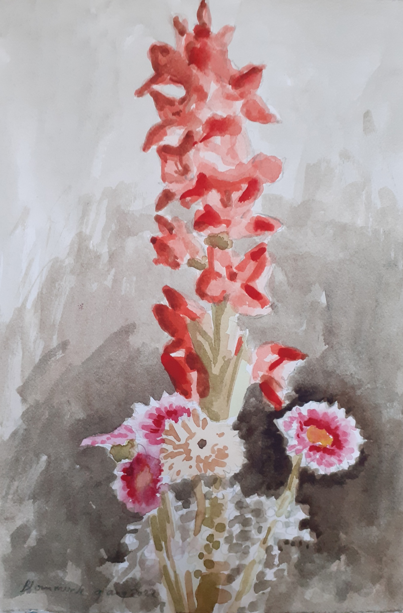 Aquarel van gladiool en gerbera's