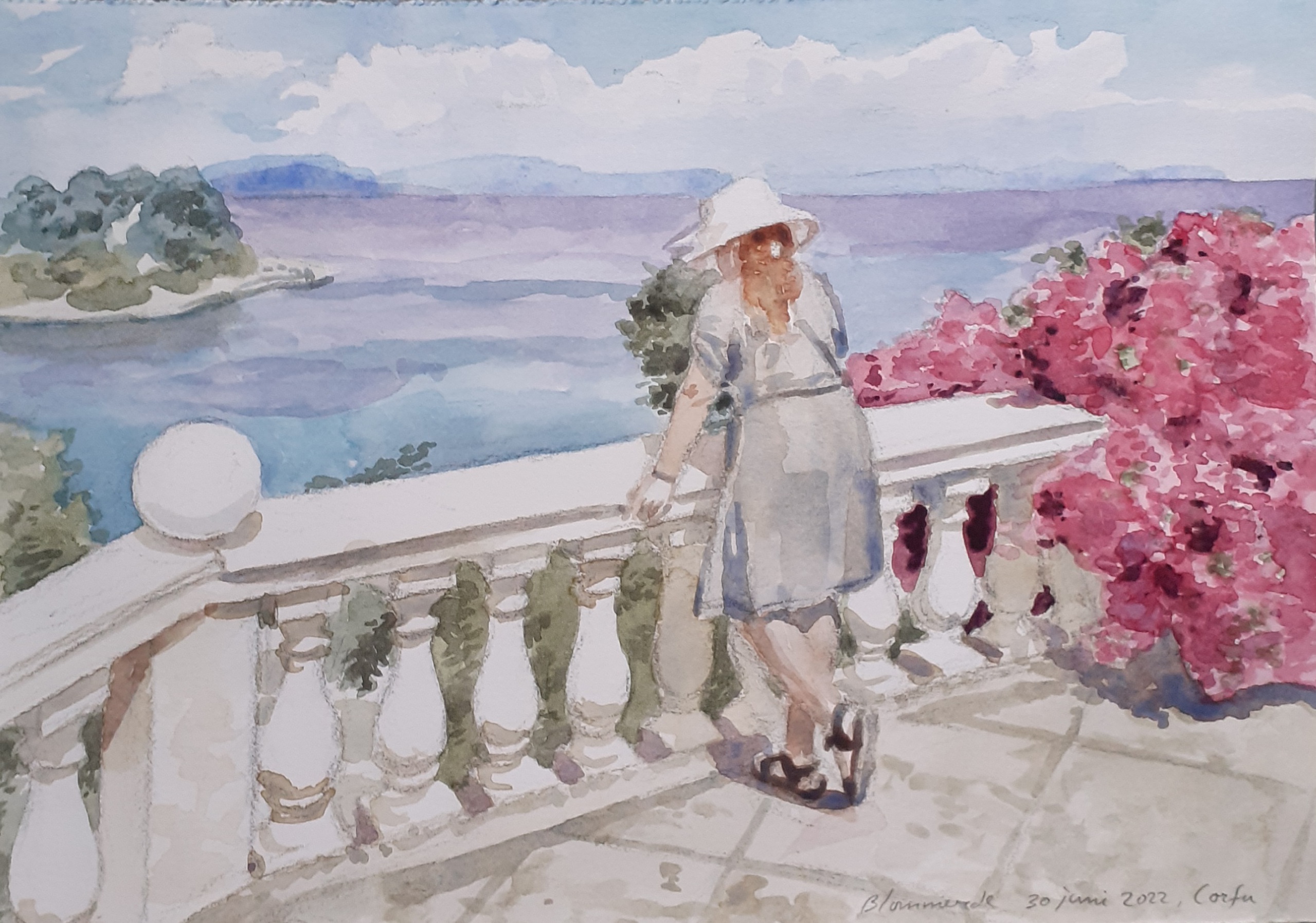 Figuratief Realistisch Aquarel Zeegezicht Corfu Vrouw Balustrade