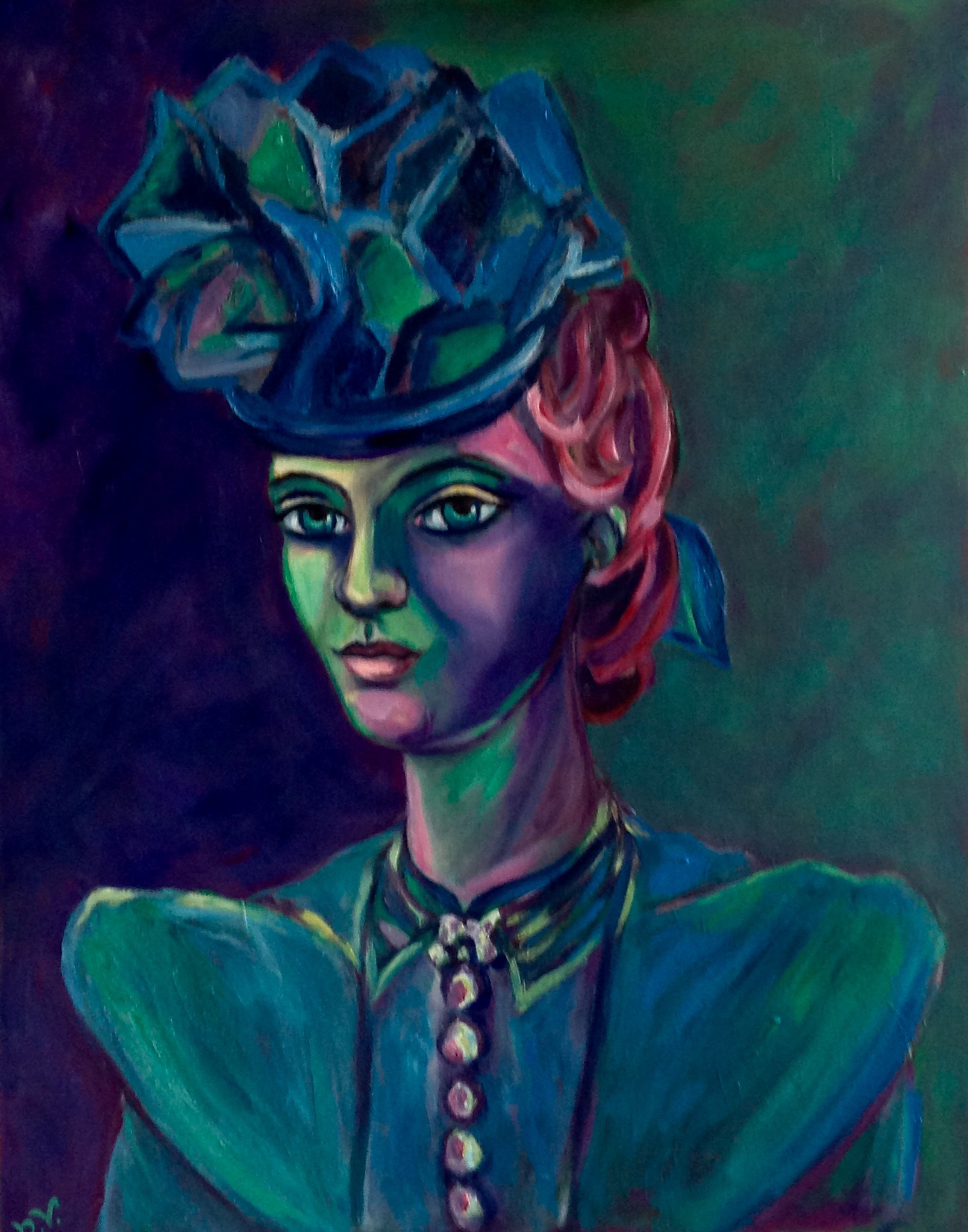 Paars/ groen dame met hoed, 90x70, incl.lijst