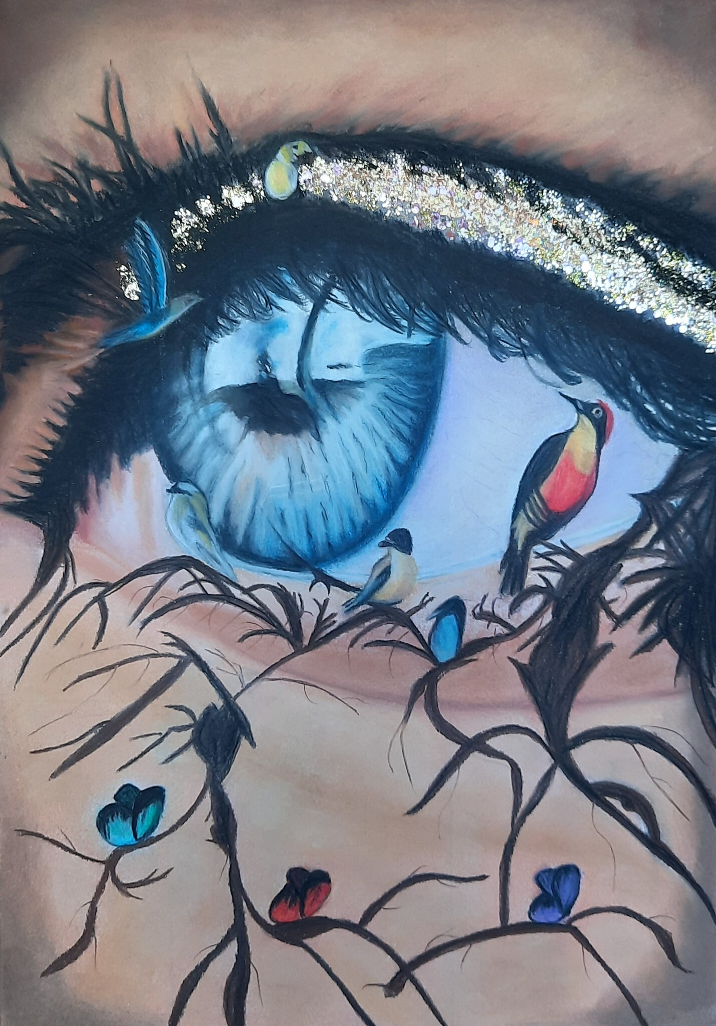Mooi oog bewerkt met bladgoud, tak met vogels en vlinders ervoor. Ingelijst met passe partout