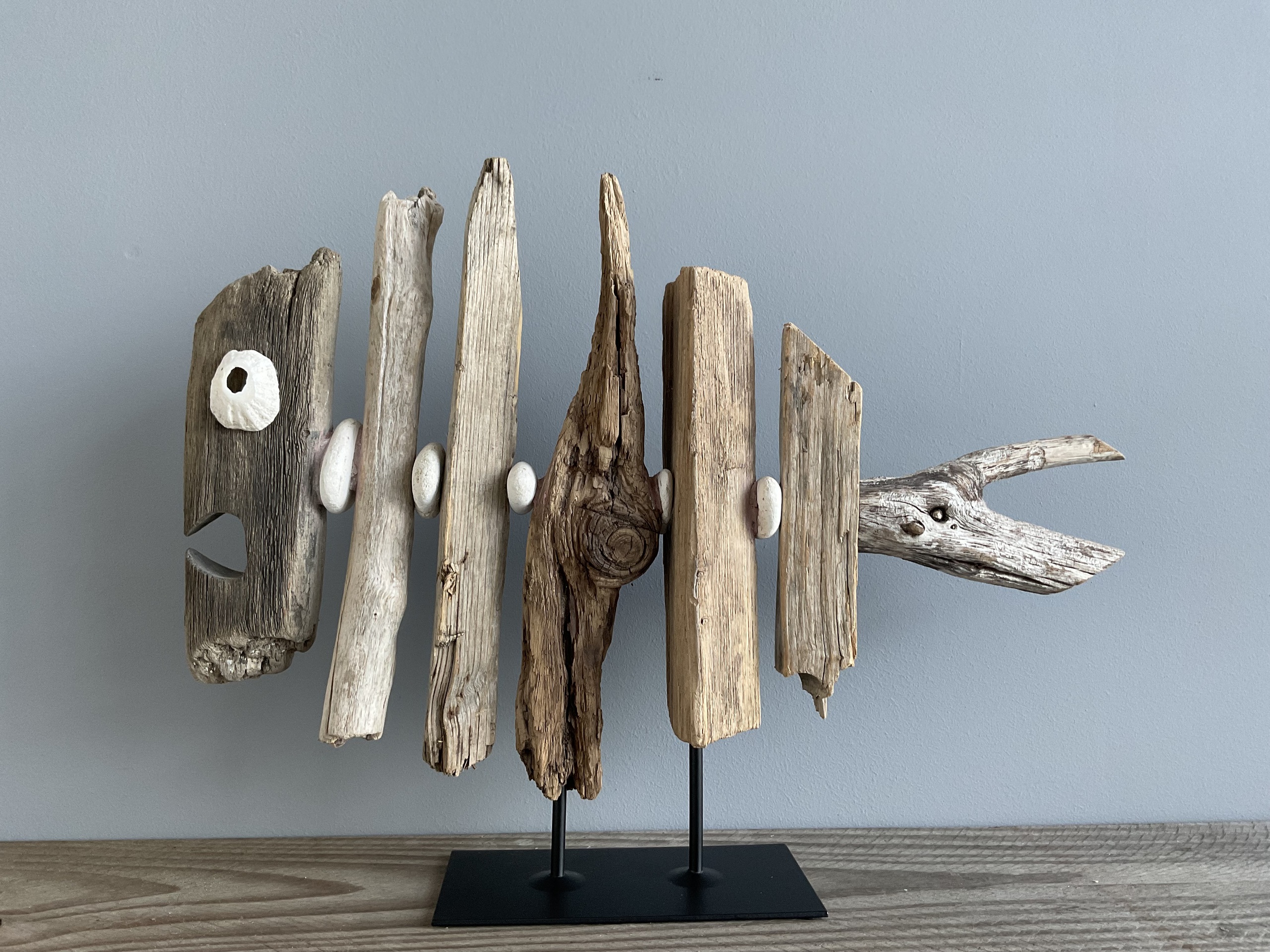 maakt al jaren houten beelden door natuurlijke objecten uit zee te koppelen. De beelden zijn ruw en puur.