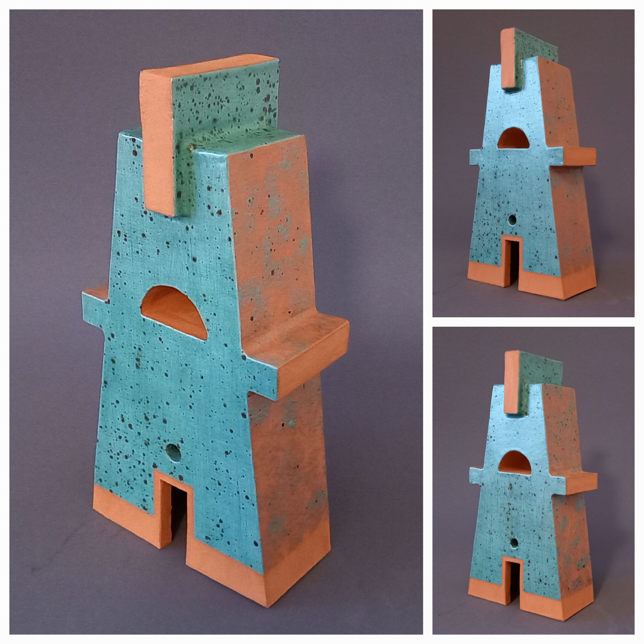 Geïnspireerd door de Italiaanse architect Massimo Scolari is dit gebouwtje ontstaan. Een "Italiaanse" Toren in rode klei met een turquoise spikkelglazuur.