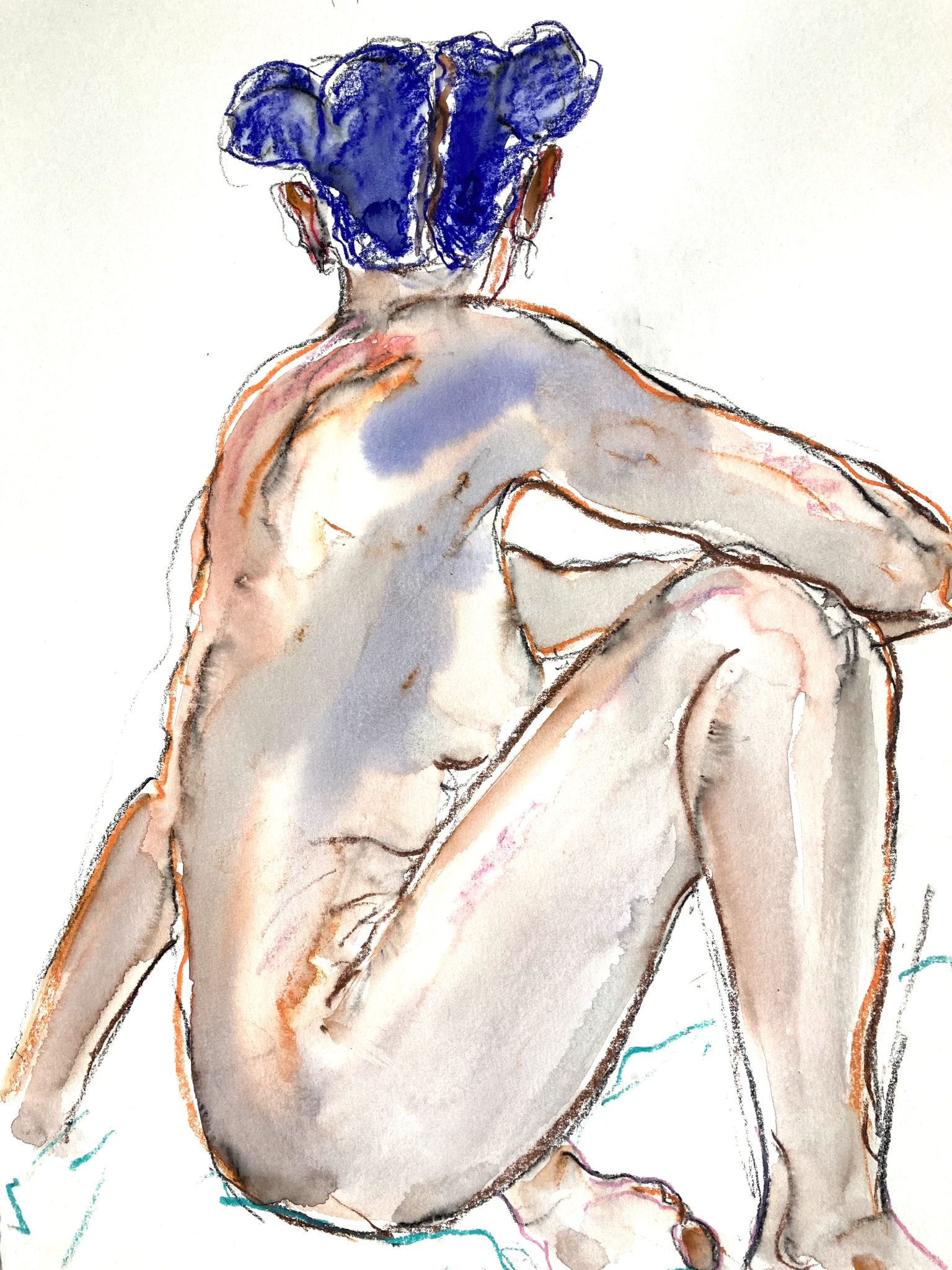 Zittende vrouw met staartjes op de rug gezien